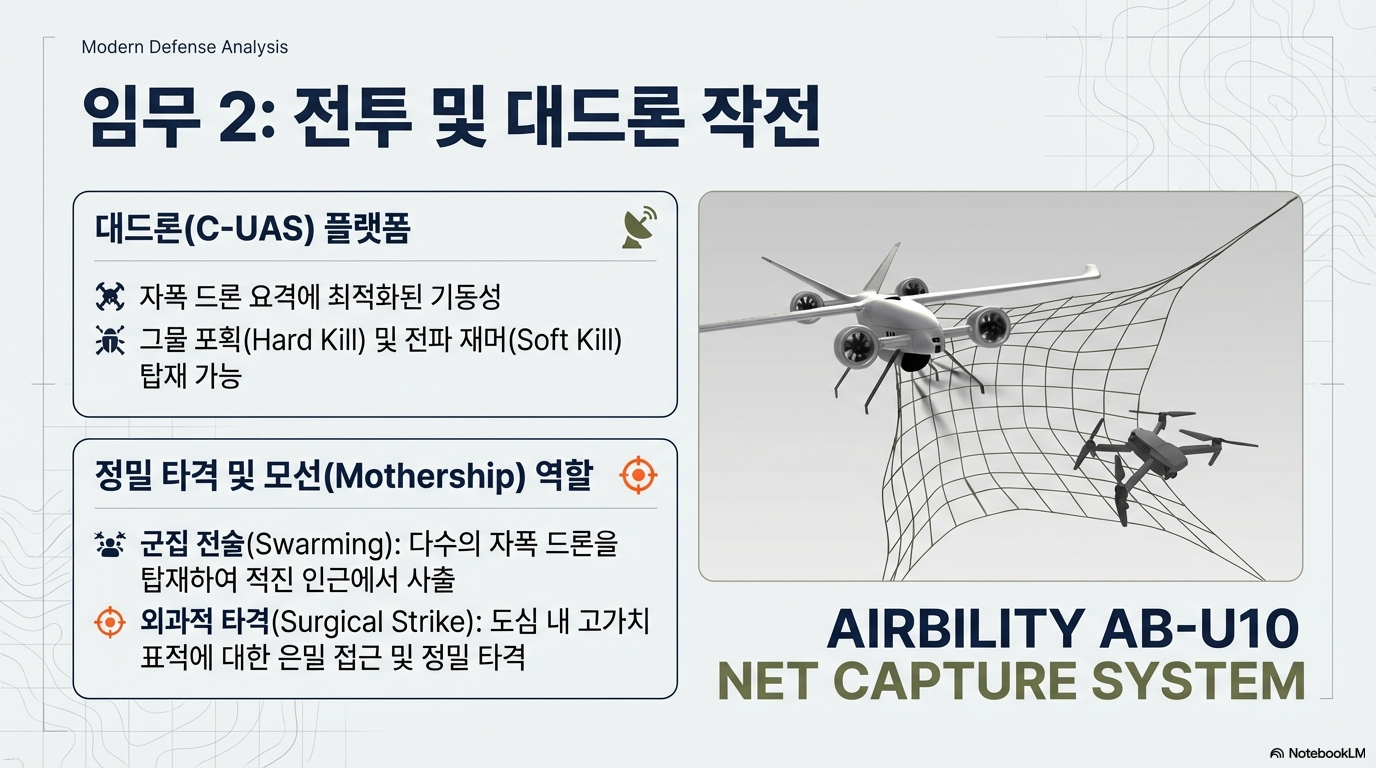현대전의 새로운 골칫거리로 떠오른 저비용 자폭 드론. 군용 eVTOL은 이 드론 떼를 막아낼 가장 효과적인 대드론(C-UAS) 플랫폼으로 진화하고 있습니다. 그물로 포획하거나 전파 교란 장치(재머)로 무력화시키는 등 다양한 방식으로 적 드론을 요격할 수 있습니다.