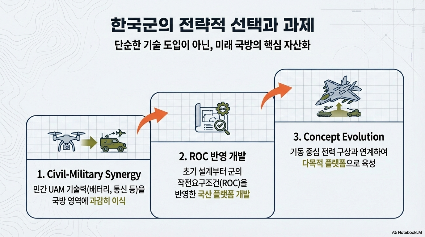 이제 우리 군 역시 민간의 도심항공교통(UAM) 기술을 군사 영역에 적극적으로 접목하고, 우리 전장 환경에 맞는 한국형 군용 eVTOL 개발에 박차를 가해야 합니다. 미래 전장의 주도권은 더 강력한 무기가 아니라, 새로운 개념의 플랫폼을 어떻게 설계하고 운용하느냐에 달려있기 때문입니다.