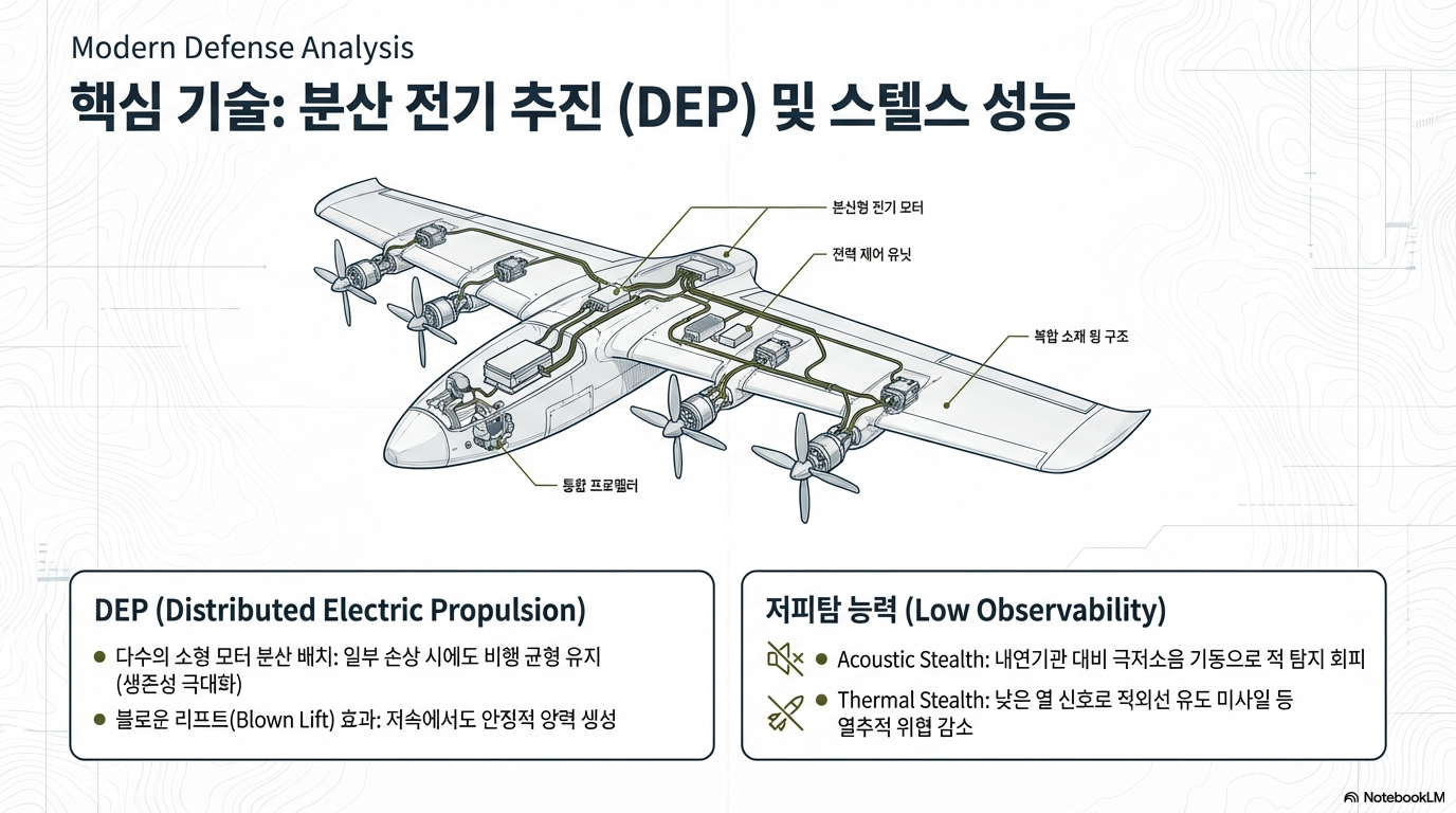이 놀라운 정숙성의 핵심은 ‘분산 전기 추진(DEP)’ 기술에 있습니다. 하나의 크고 시끄러운 중앙 엔진 대신, 여러 개의 작은 전기 모터를 기체 곳곳에 분산 배치하는 방식입니다. 이는 소음을 극적으로 줄일 뿐만 아니라, 일부 모터가 손상되어도 나머지가 출력을 조절해 비행을 유지할 수 있어 생존성까지 높여줍니다. 이 '저소음·저열' 특성은 적의 음향 탐지망이나 적외선 센서를 무력화시키며 발각될 위험을 최소화합니다.