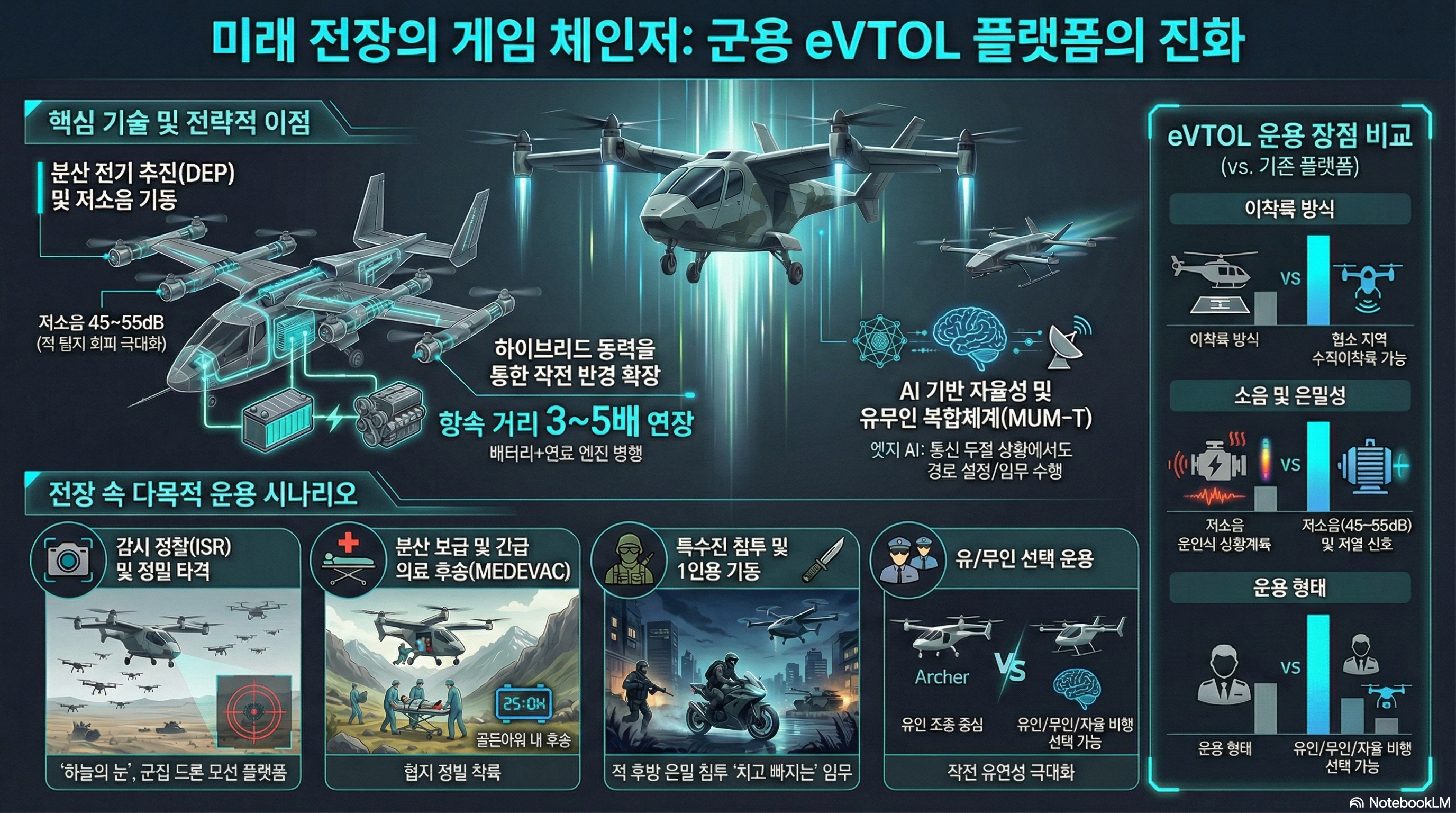 미래 전장의 하늘은 더 이상 크고 시끄러운 기계가 아니라, 조용하고 똑똑한 날개로 다시 그려지고 있습니다. eVTOL은 그 날개의 이름이며, 한국군이 그 위에 올라탈 준비를 할 시간은 바로 지금입니다.