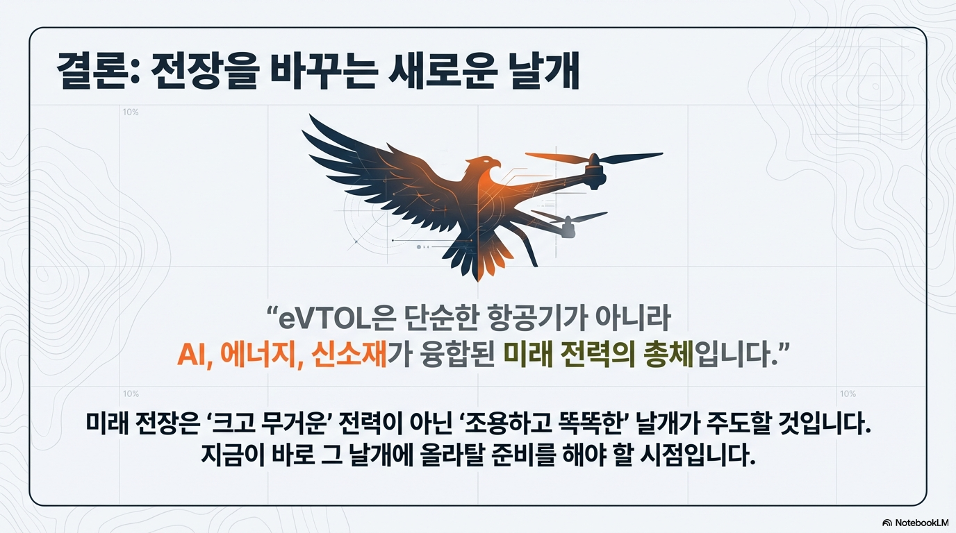 지금까지 살펴본 것처럼, 군용 eVTOL은 단순한 비행 기술의 발전이 아닙니다. AI, 에너지, 신소재 기술이 융합되어 기동성, 은밀성, 생존성의 기준을 재정의하는 새로운 '작전 개념'의 플랫폼입니다.