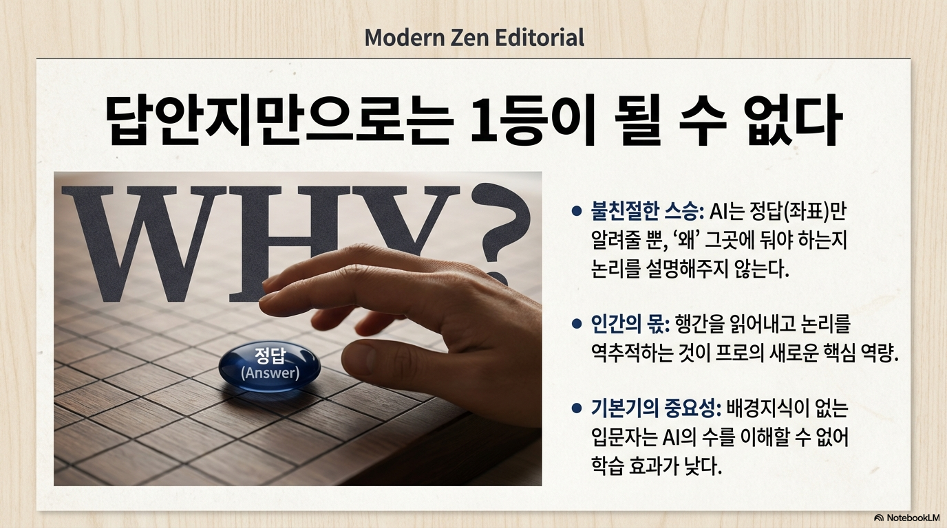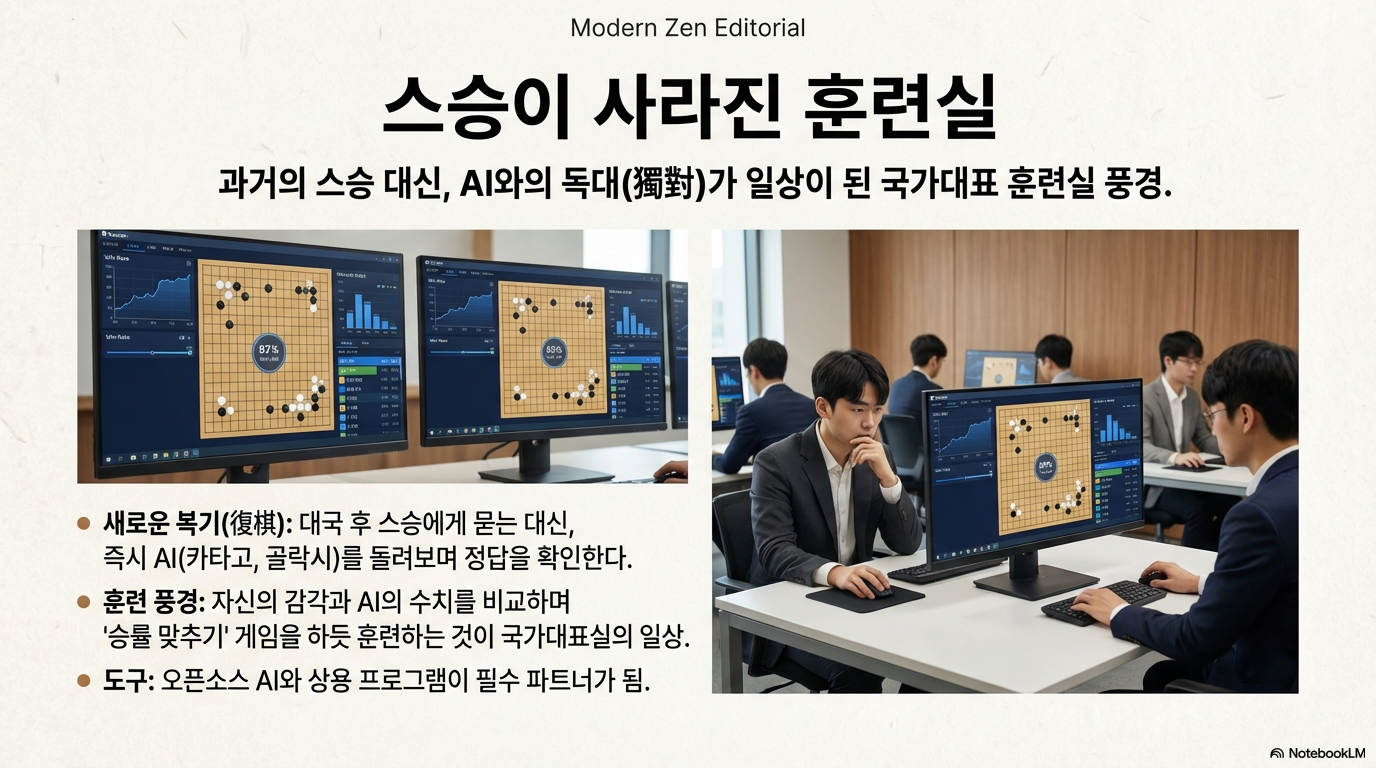 오늘날 2000년대생 젊은 기사들에게 사범님의 복기는 참고사항일 뿐이다. 사범님의 설명이 끝나기 무섭게 그들은 스마트폰을 켜고 AI의 그래프를 확인한다. 데이터 기반의 개인주의적 학습이 가져온 효율성은 극대화되었으나, 스승과 제자가 교감하며 바둑의 '도(道)'를 논하던 낭만은 데이터의 홍수 속으로 사라졌다.