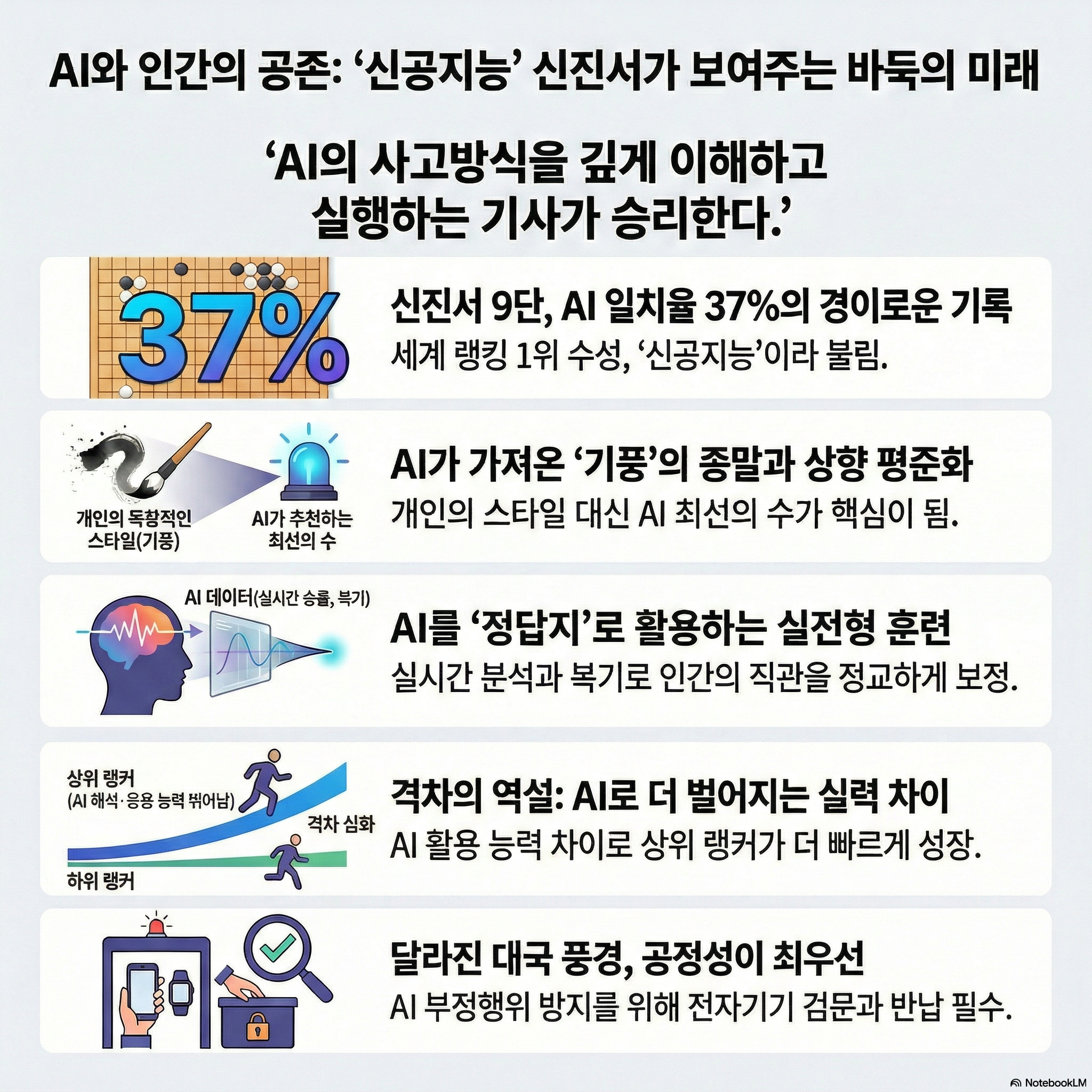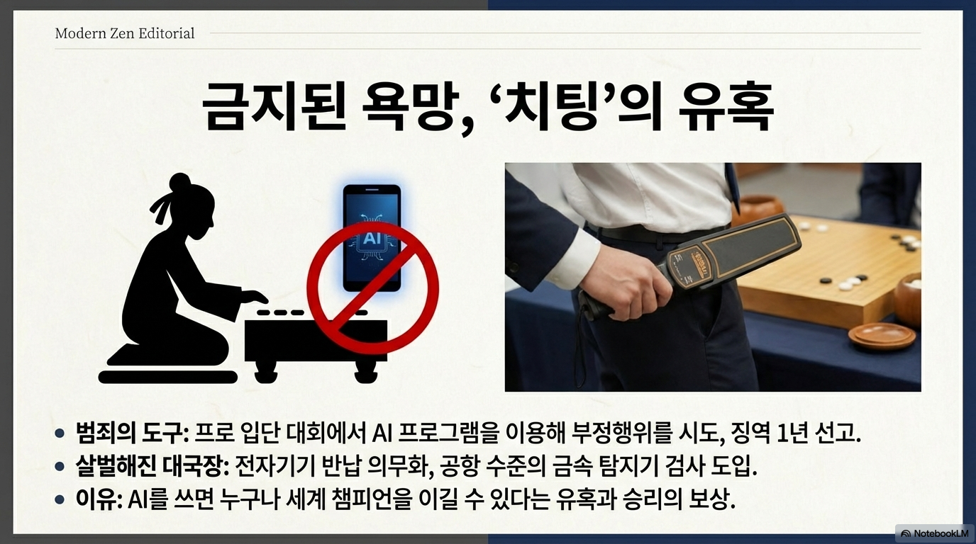 기술의 발달은 공정성의 문제도 야기했다. 입단 대회에서 AI를 몰래 활용하다 적발되어 징역 1년의 실형을 선고받은 사건은 기술이 인간의 도덕성을 어떻게 시험하는지를 보여준다. 분석 결과, 해당 기사가 AI와 일치하는 수를 둘 확률은 '100만분의 1'에 불과했다. 기술이 인간의 한계를 뛰어넘는 도구가 되었을 때, 인간은 너무나 쉽게 그 유혹에 굴복할 수 있다는 서늘한 경고다.