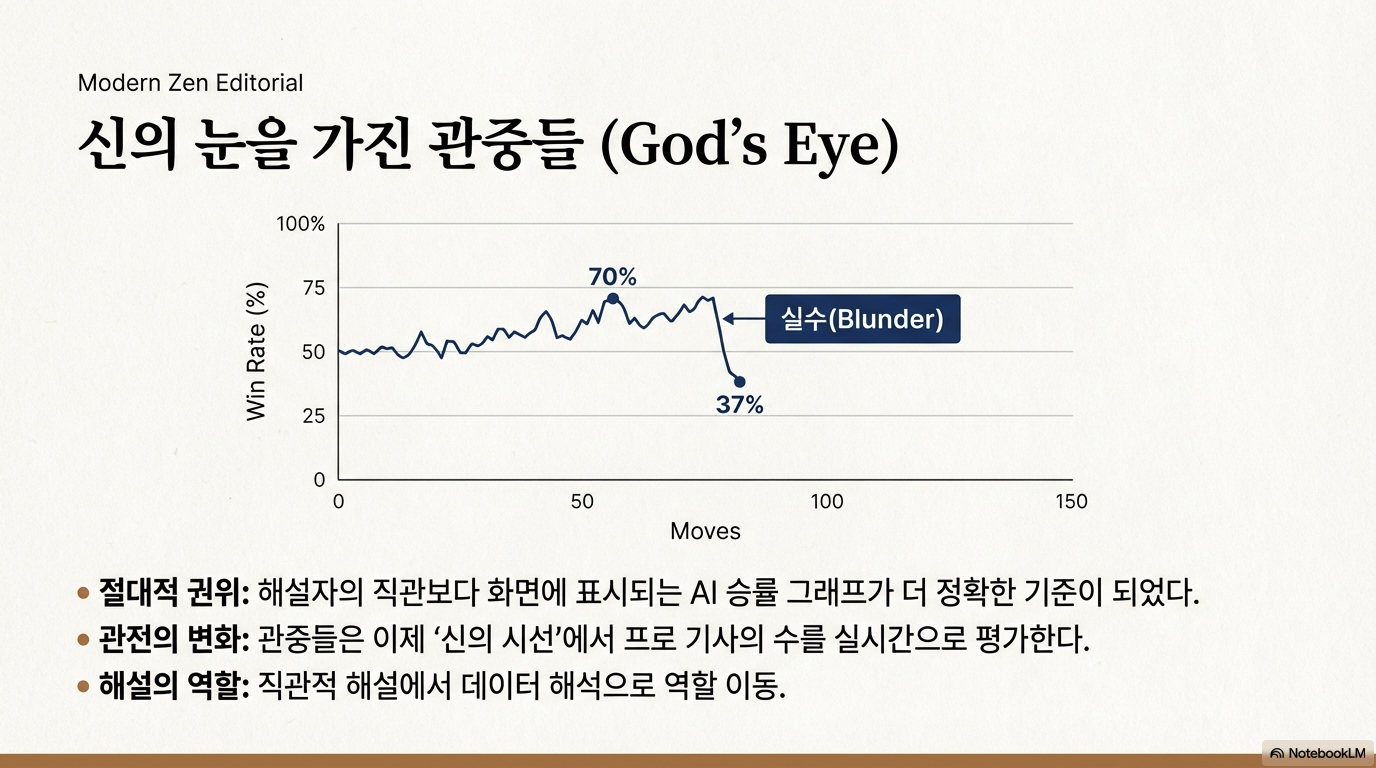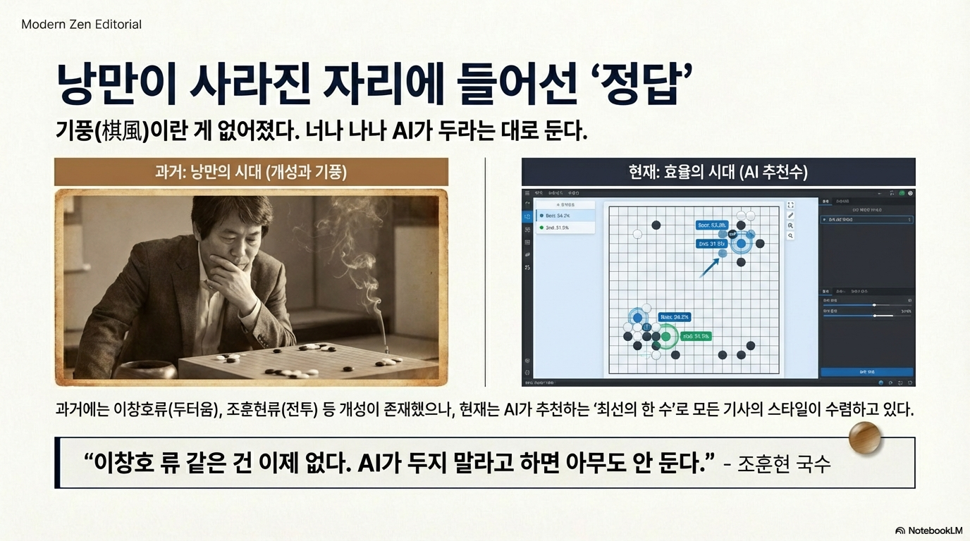 과거의 바둑은 한 사람의 인생관과 철학이 투영된 예술이었다. 조훈현 국수의 화려한 전신(戰神)적 감각이나 이창호 9단의 정교한 계산은 그 자체로 하나의 '기풍'이었으며, 팬들은 그 개성에 열광했다. 그러나 모든 수에 대해 인공지능이 승률 기반의 '블루스팟(최선의 수)'을 실시간으로 제시하게 되면서, 바둑판 위에서 기풍이라는 단어는 희미해졌다.