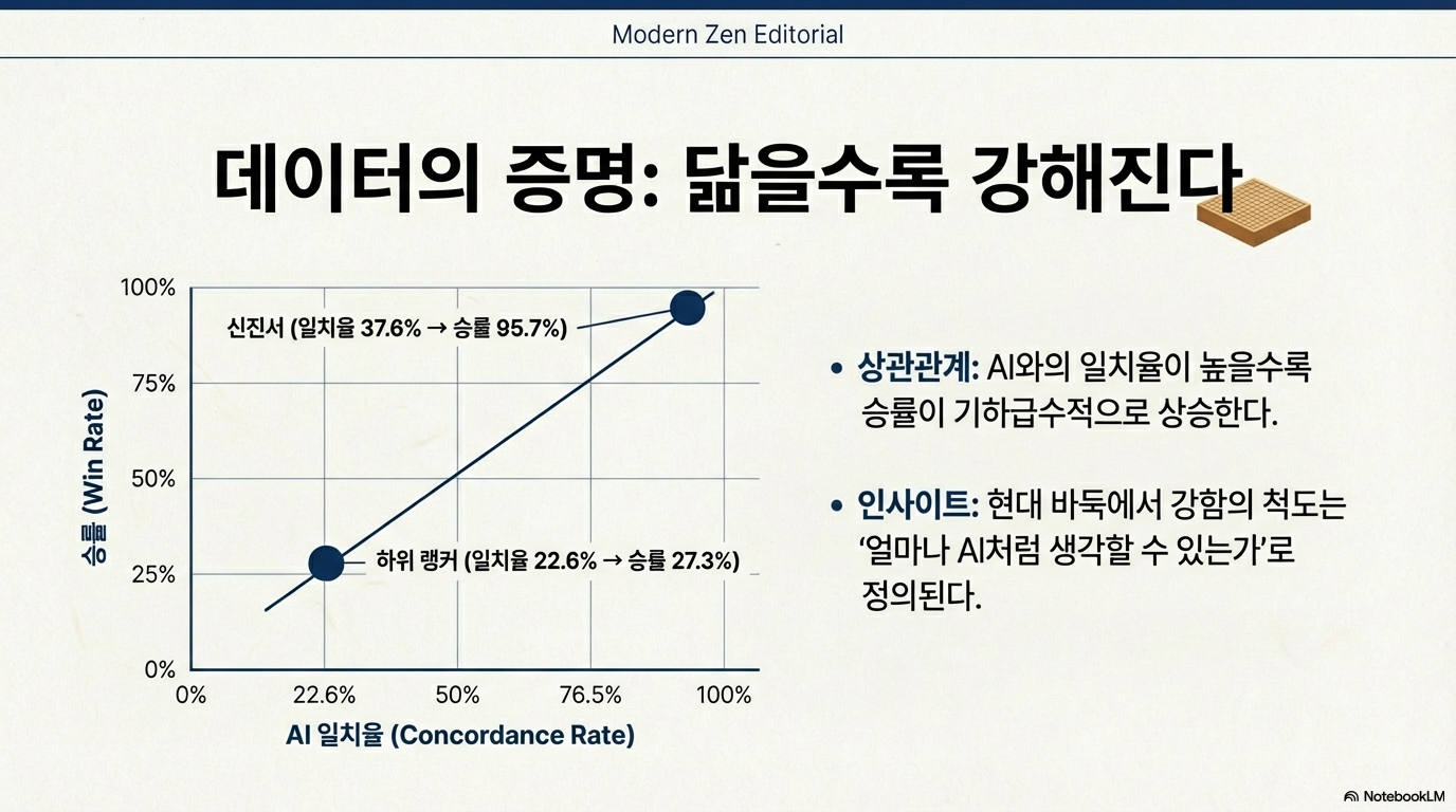 이러한 정답 사회에서 가장 압도적인 성취를 거두고 있는 인물이 바로 세계 랭킹 1위 신진서 9단이다. 대중은 그를 '신공지능'이라 부른다. 데이터가 증명하듯 그의 수는 인공지능과의 착수 유사도가 무려 37.6%에 달하며, 이는 95.7%라는 경이로운 승률로 이어진다.