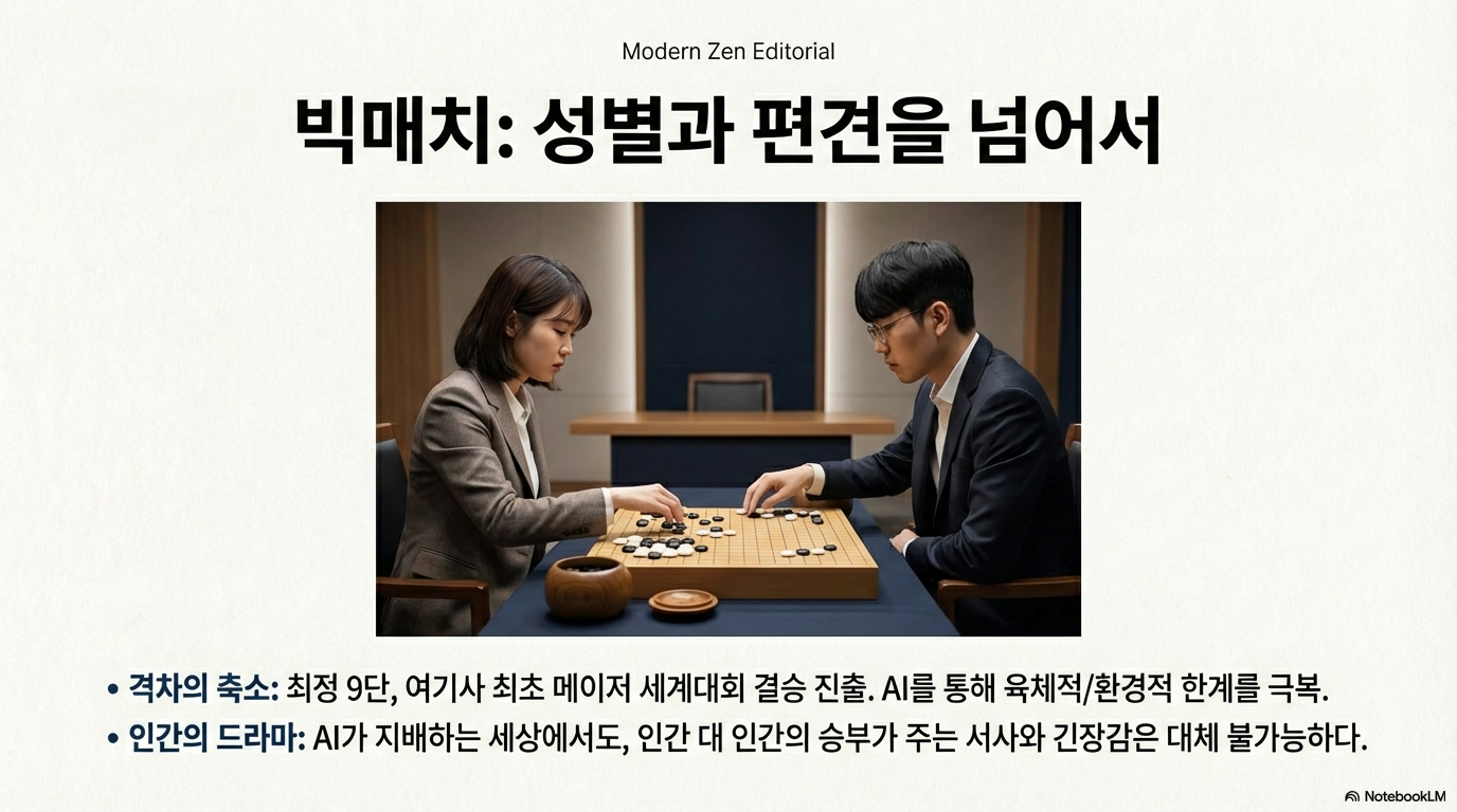 전통적인 바둑 교육은 스승이 제자의 바둑을 복기해주며 지혜를 전수하는 도제식 방식이었다. 그러나 이제 '스승의 권위'는 '알고리즘의 권위'로 대체되었다. 최정 9단은 인공지능의 등장 이후 남녀 기사 간의 정보 접근성이 평등해지며 실력 격차가 줄어들었음을 언급하지만, 그 이면에는 전통적 공동체의 붕괴라는 쓸쓸함이 자리한다.