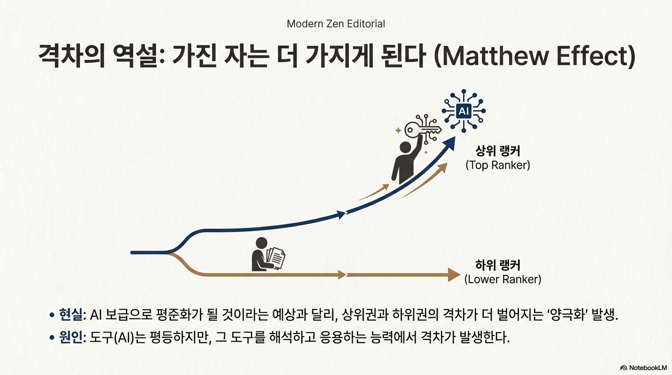 인공지능이 모두에게 공평한 정답지를 제공하므로 실력 격차가 줄어들 것이라는 예측은 빗나갔다. 오히려 상위 랭커와 하위 랭커의 격차는 과거보다 더 심화되는 '지식의 양극화' 현상을 보이고 있다.