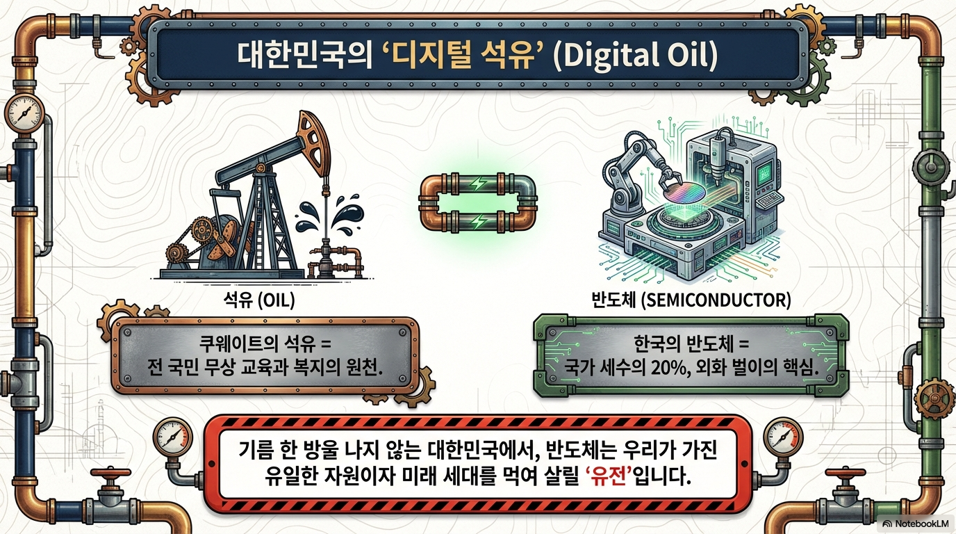 과거 쿠웨이트와 같은 산유국은 석유라는 자원 하나로 전 국민이 풍요를 누리는 시대를 살았습니다. 오늘날 대한민국에서 그 '기름'의 역할을 수행하며 국가의 명운을 지탱하는 것이 바로 반도체입니다.