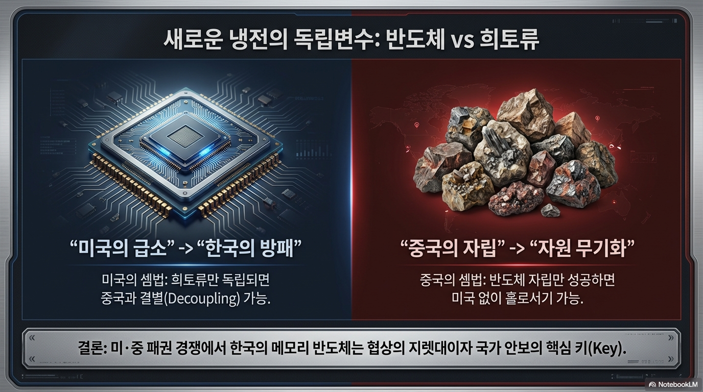 "미국은 냉정하게 한국의 가치를 오직 '반도체 가치'로 보고 있습니다. 우리가 가진 메모리 기술력은 미국의 '대중국 결별 선언'을 가능하게 할 유일한 전략적 열쇠이기 때문입니다."