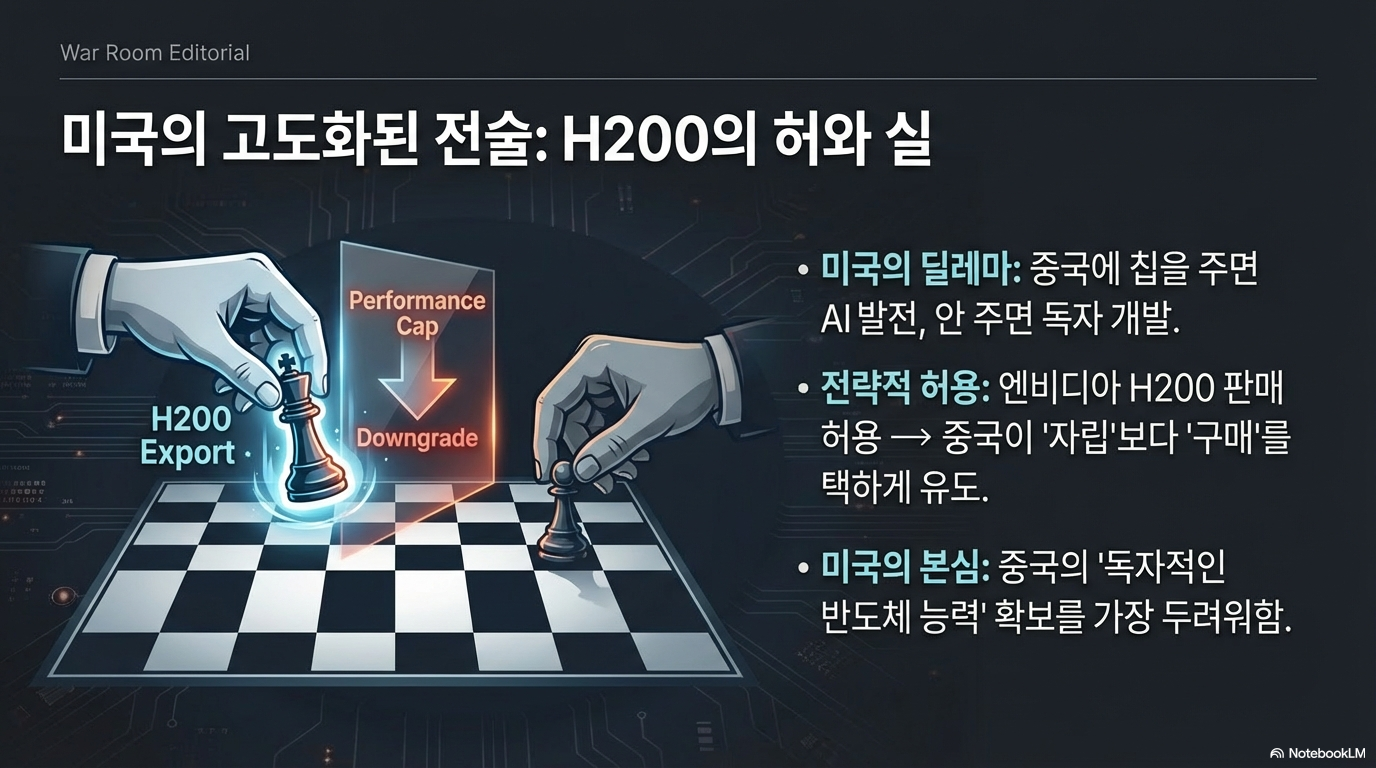 • 전략적 지연 전술: 흥미로운 점은 미국의 대응입니다. 미국은 엔비디아의 저사양 칩인 'H200'의 중국 공급을 허용했는데, 이는 중국이 고성능 칩을 자체 개발하려는 의지를 꺾고 자립 속도를 늦추려는 고도의 전략적 판단입니다.