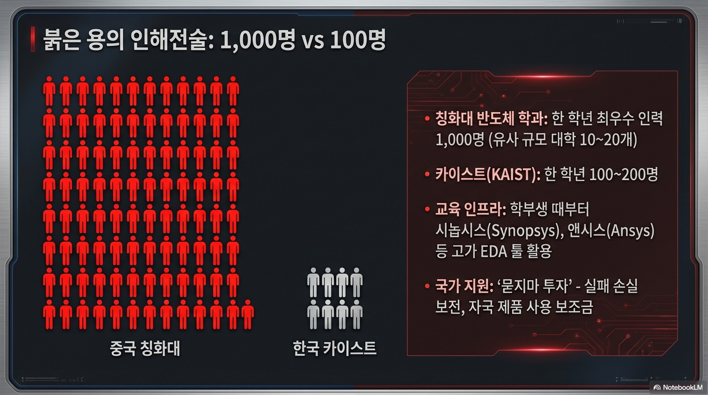 • 양적 공세의 공포: 중국 칭화대학교 등 주요 대학은 학과당 반도체 전공 인력만 1,000명씩 쏟아냅니다. 이들은 카이스트와 동일한 교재를 쓰며, '시납시스(Synopsys)'와 '엔시스(Ansys)' 같은 글로벌 표준 EDA(설계 자동화) 툴을 완벽히 다룹니다.