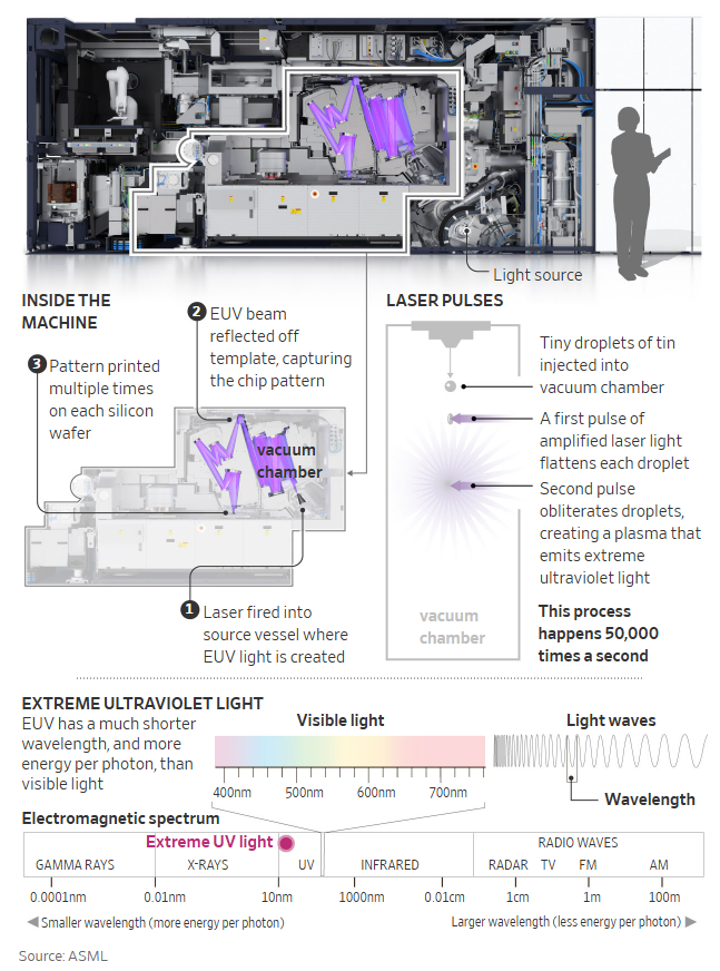 EUV 기계는 놀라운 기술의 집약체입니다. 액화 주석 방울을 레이저로 폭발시키고 이를 통해 생성된 빛을 사용해 실리콘 웨이퍼에 수십억 개의 트랜지스터 패턴을 새깁니다. 그 빛의 파장은 불과 13.5나노미터로, 인간 머리카락보다 10,000배 더 세밀한 해상도를 자랑합니다.