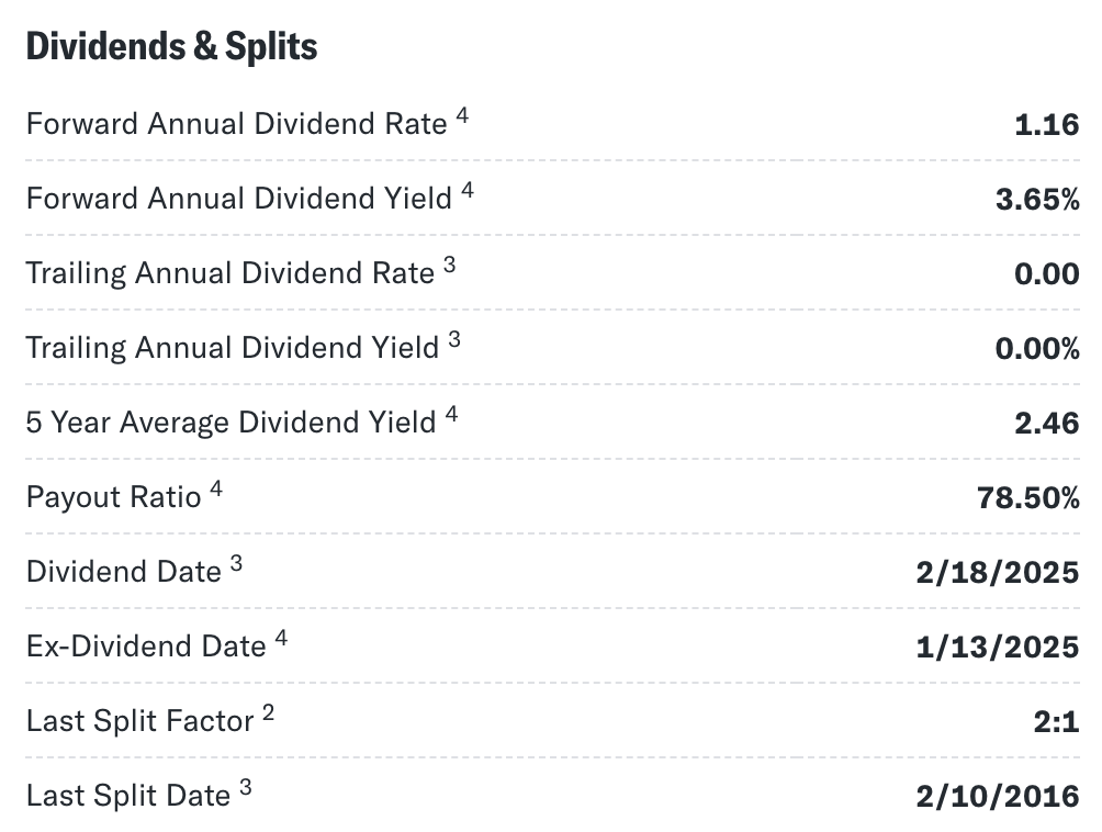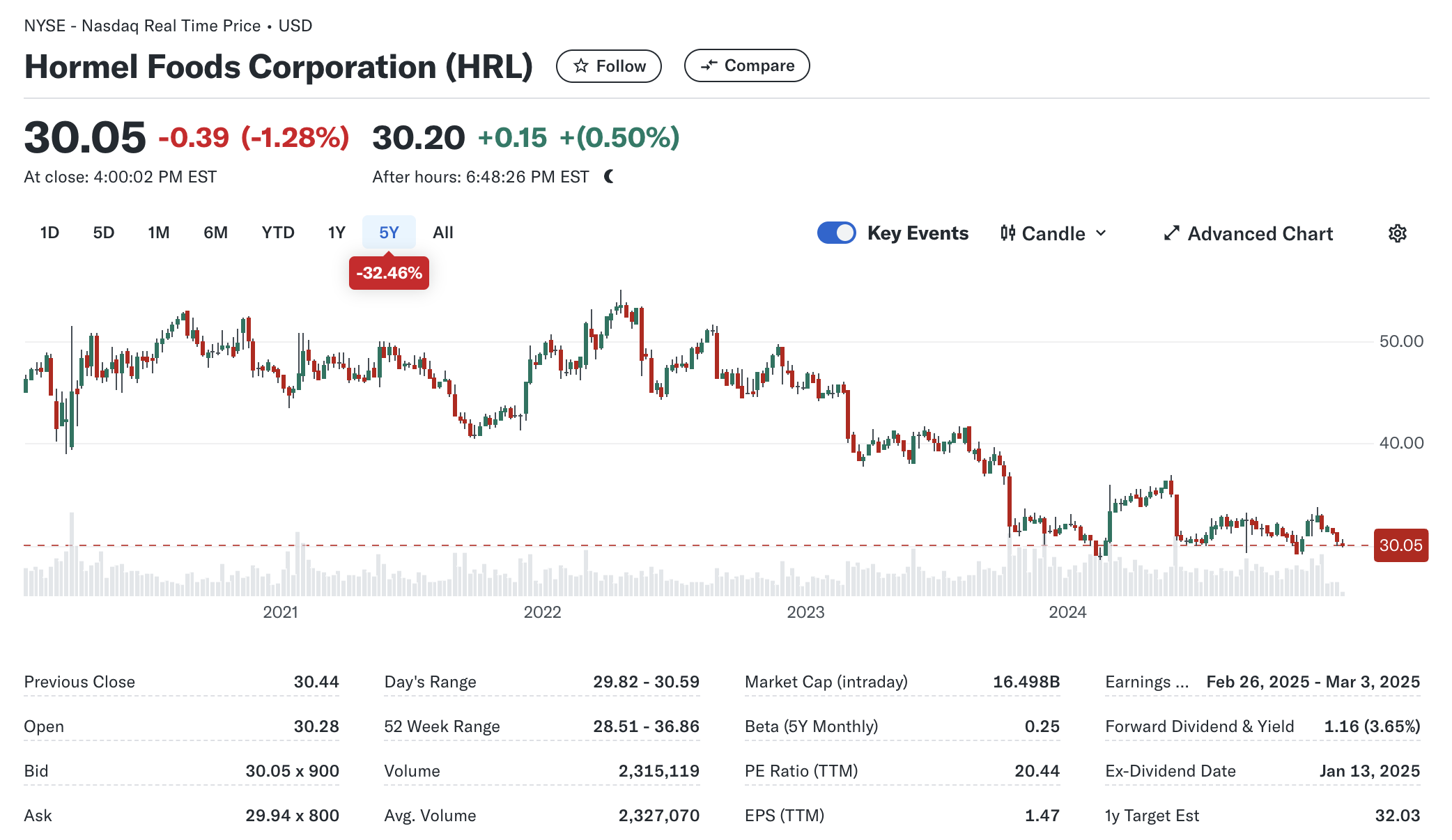호멜 푸드는 배당왕에 속하는 또 다른 소비재 기업으로, 현재 약 **3.6%**의 배당 수익률을 제공하고 있습니다. 이는 최근 몇 년 동안의 최고 수준입니다. 그러나 주가는 52주 고점에서 15% 하락했을 뿐만 아니라, 2022년 초 3년 최고치 대비 40% 이상 하락한 상태입니다.