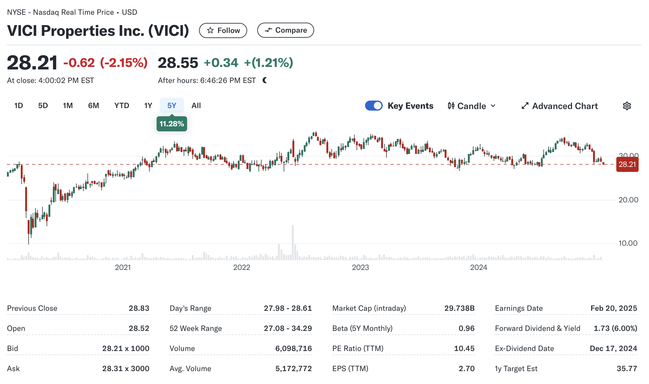 최근 주가 하락으로 인해 배당 수익률은 시장 평균을 크게 웃도는 **5.8%**에 도달했습니다. 안정적이고 큰 수익을 목표로 하는 보수적인 투자자라면, Vici Properties를 고려해 볼 만합니다.