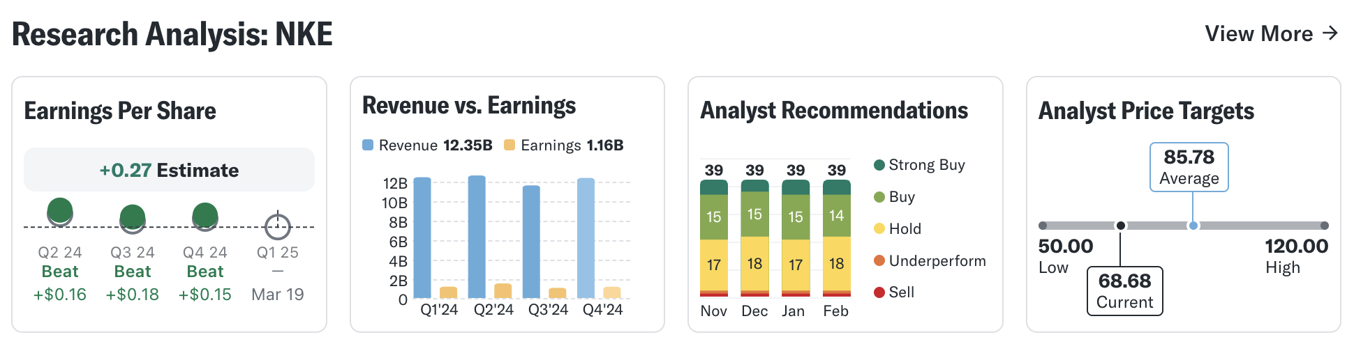- 나이키의 현재 주가는 상대적으로 낮지만, 반등을 예상하는 애널리스트도 많아 점진적인 상승 가능성이 큽니다.