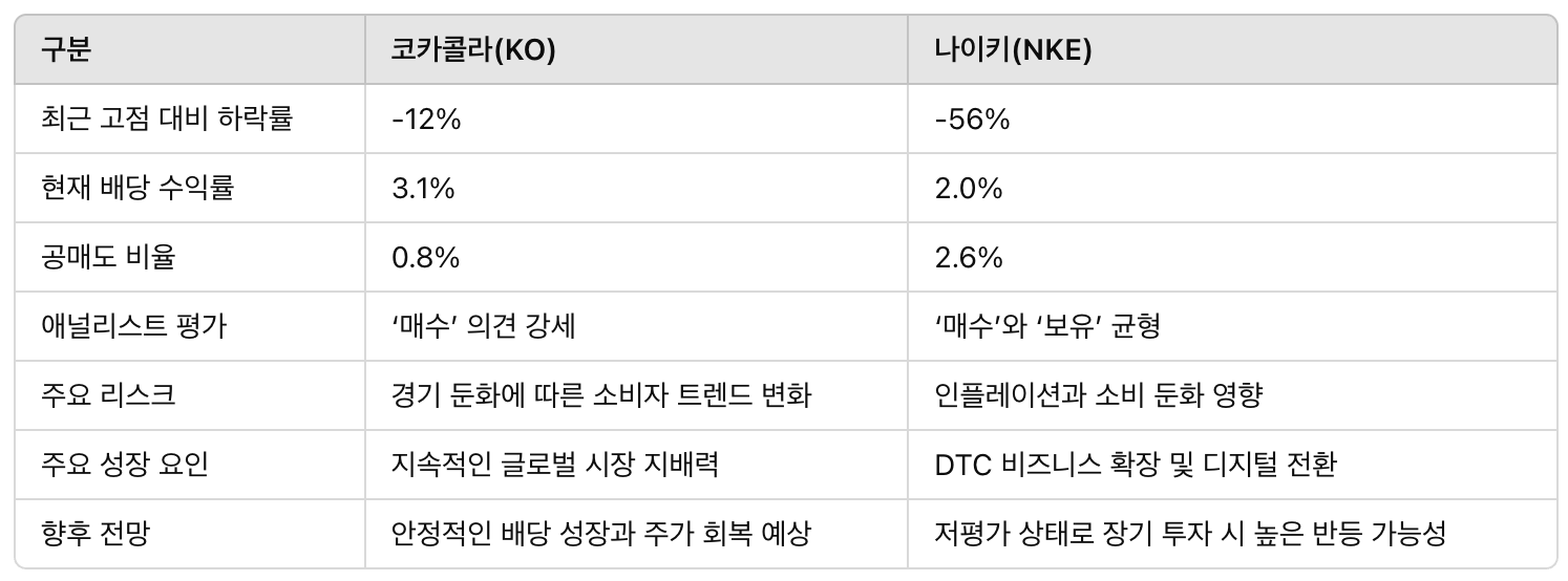 코카콜라와 나이키는 배당 성장주 중에서도 특별한 경쟁력을 갖춘 기업이며, 장기적으로 꾸준한 성장을 보여주고 있습니다. 하지만 현재 이 두 종목은 시장 변동성과 단기적인 주가 조정으로 인해 저평가된 상태이며, 이는 장기 투자자들에게 드문 기회를 제공하고 있습니다.