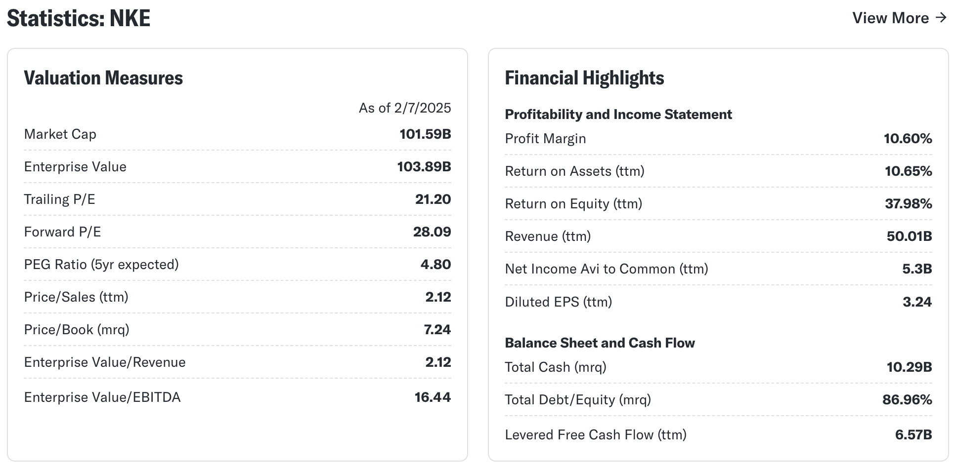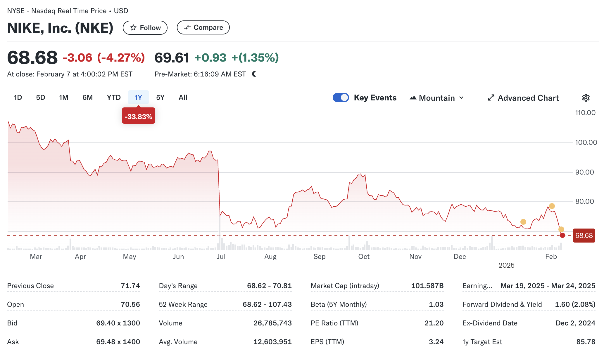 🔻 나이키(NKE): 2021년 11월 최고점 대비 56% 하락