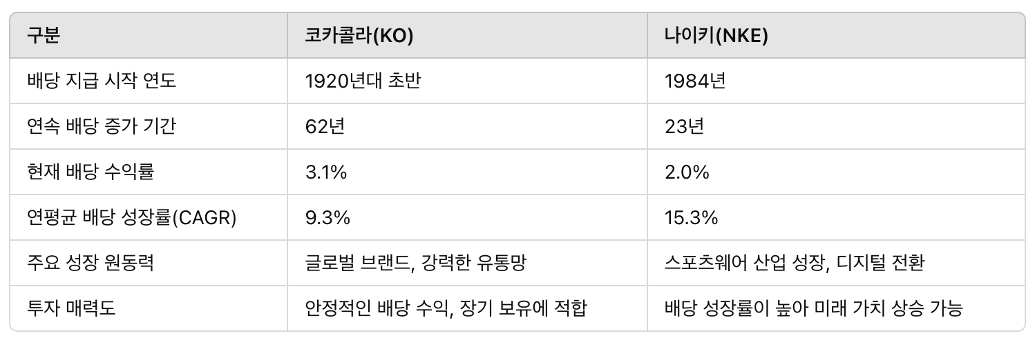 코카콜라는 오랜 기간 배당을 지급하며 안정적인 현금 흐름을 제공하는 블루칩(blue chip) 기업, 나이키는 배당 성장률이 높고 장기적으로 배당 투자에 유리한 성장형 기업입니다.