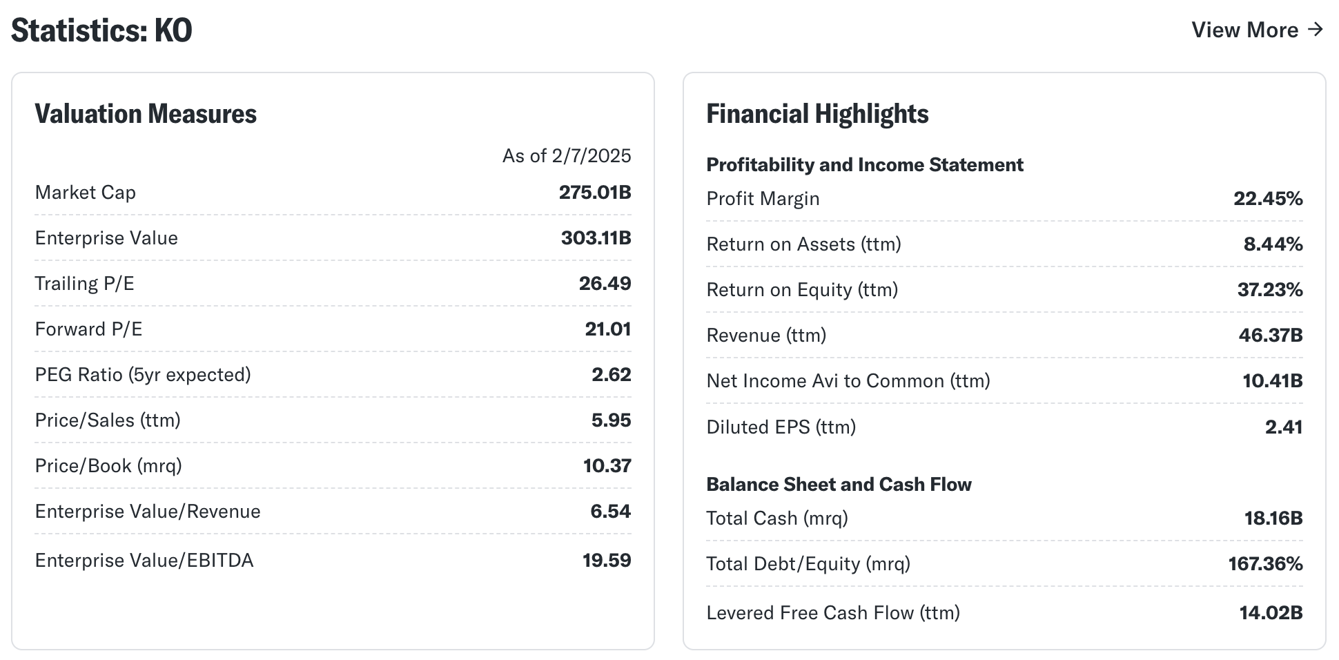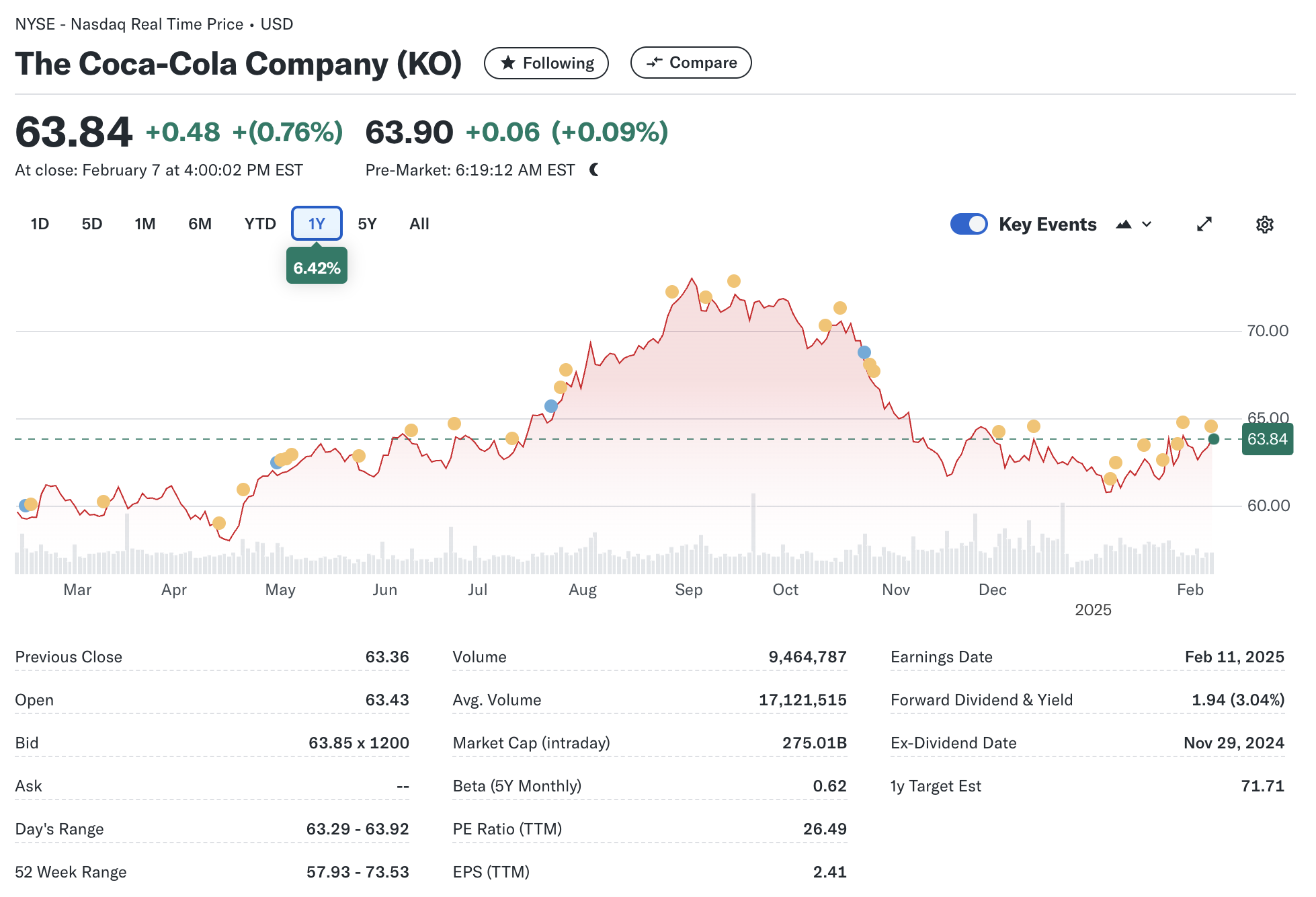🔻 코카콜라(KO): 2024년 9월 최고점 대비 12% 하락