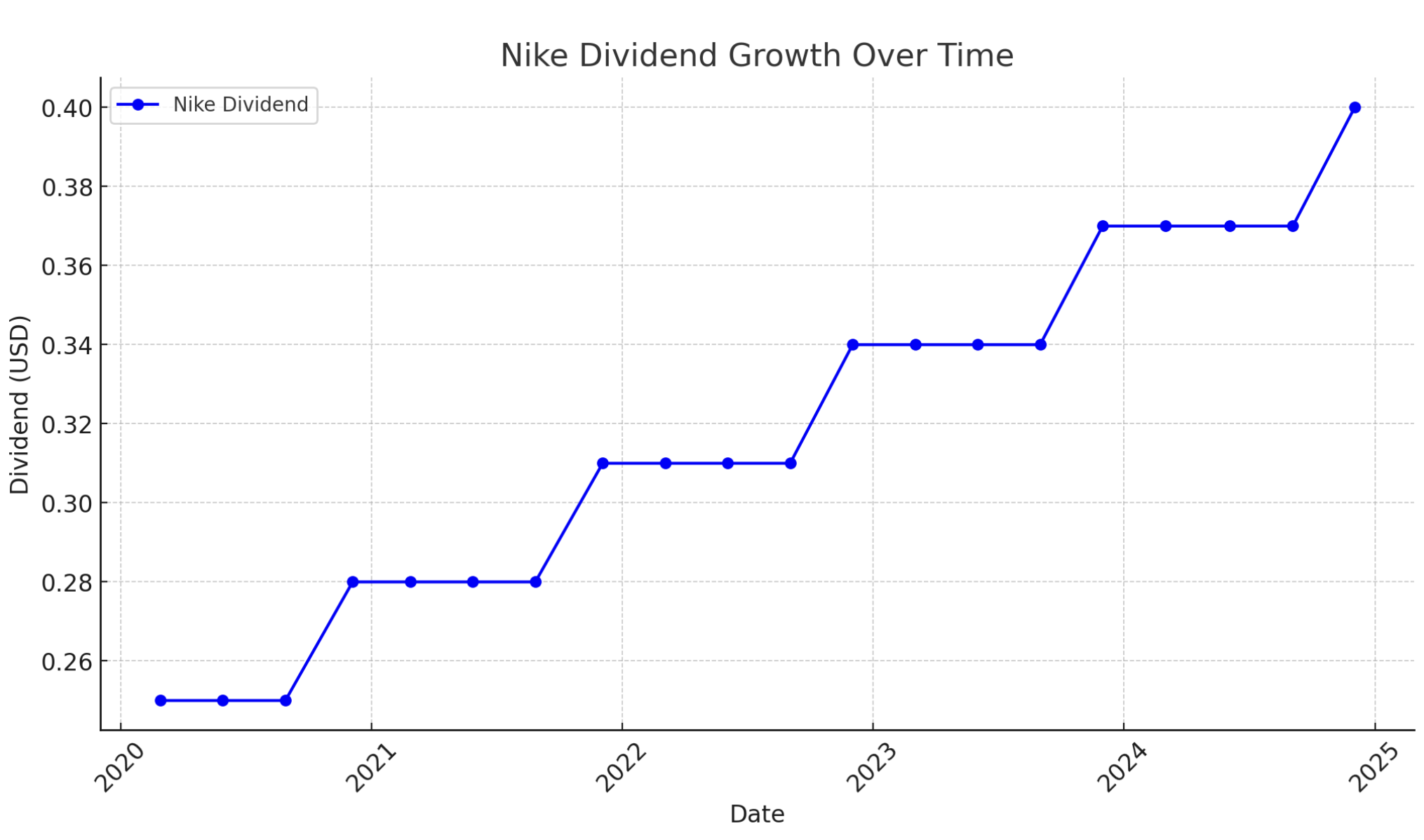 나이키는 다소 낮은 배당 수익률(약 2%)을 제공하지만, 지속적인 배당 증가로 인해 장기 투자 시 큰 수익을 기대할 수 있는 종목입니다.