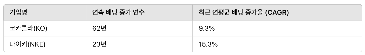 ✅ 배당 성장 기록이 확고한 기업 (KO: 62년, NKE: 23년 연속 증가)