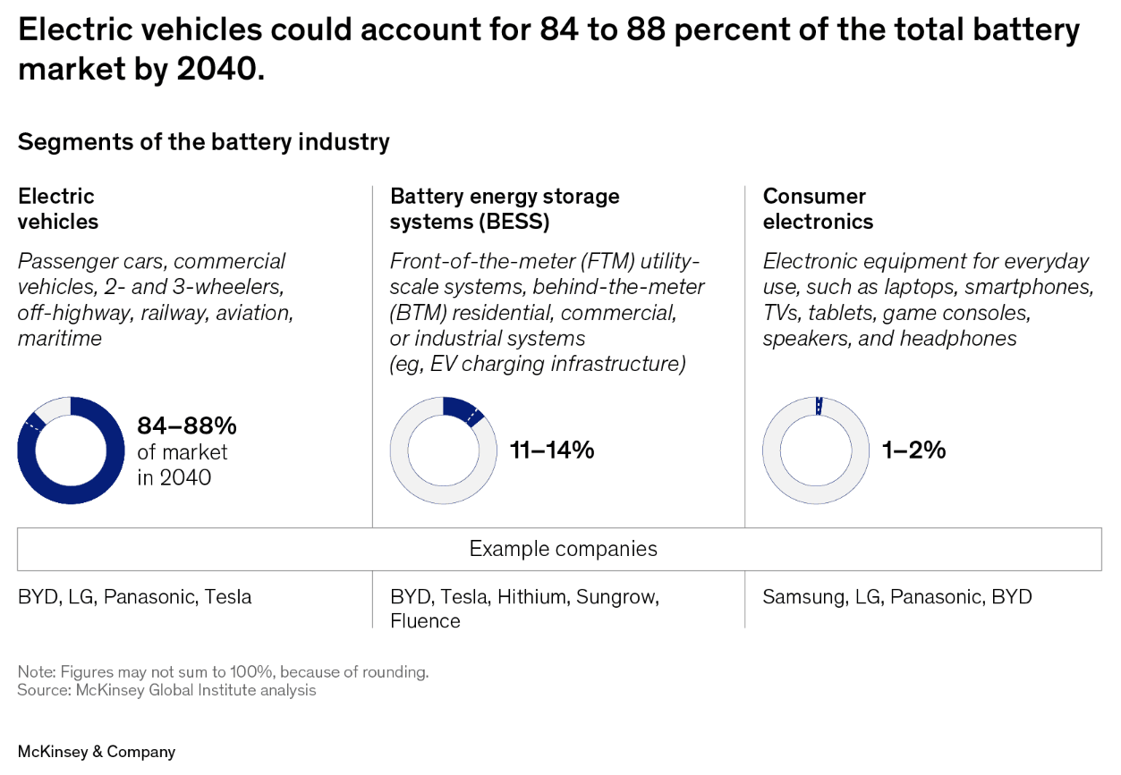 - 전기차(EV): 전기차용 배터리는 향후 배터리 수요의 80% 이상을 차지할 것으로 전망됩니다. 2022년 기준 전 세계적으로 650 GWh에 달하는 전기차 배터리 생산 용량이 2040년에는 1만 GWh 이상으로 증가할 것으로 예측되며, 전기차 배터리 시장 매출은 85억 달러에서 2040년에는 700억에서 950억 달러에 달할 것으로 보입니다.