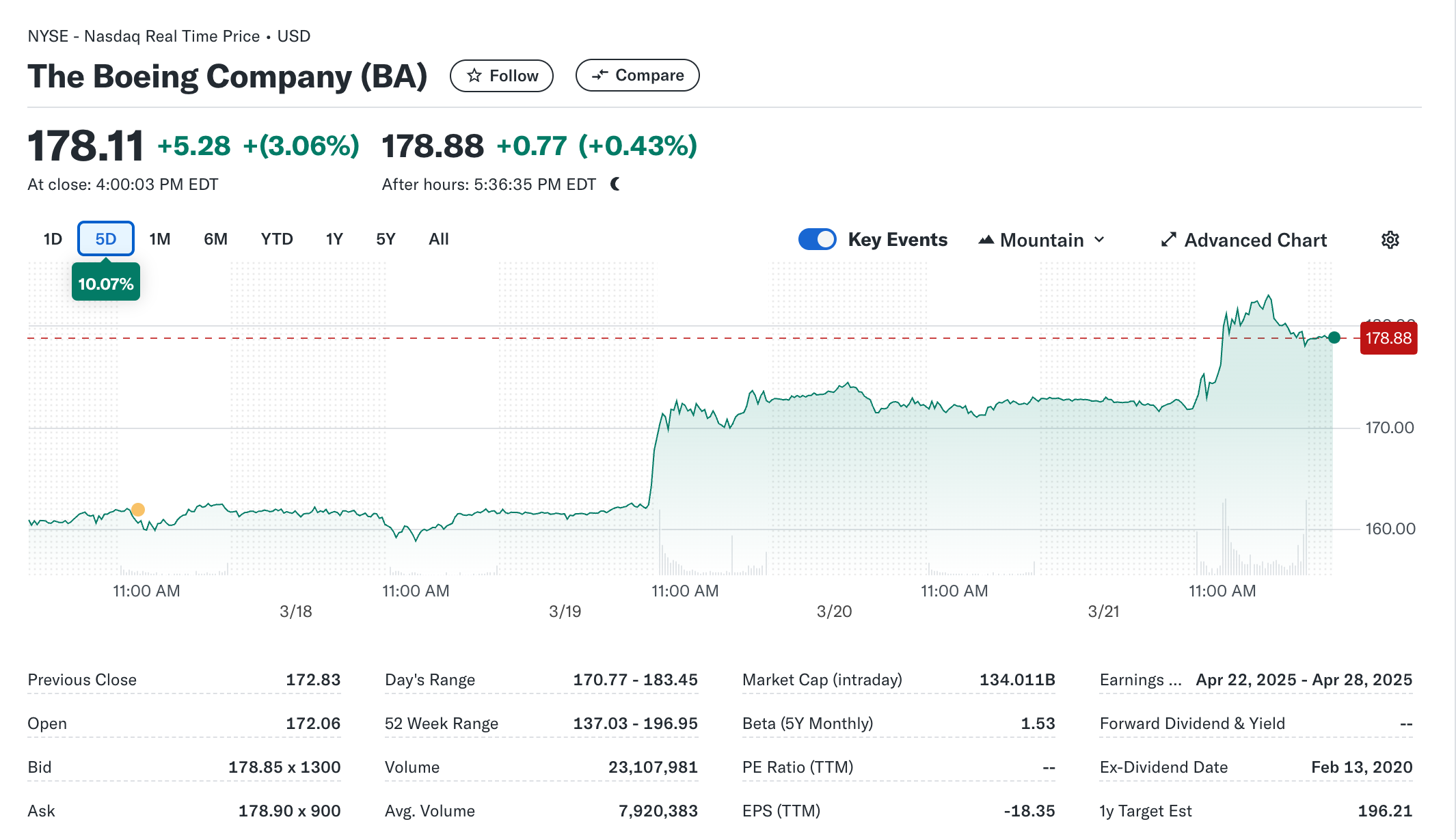 그러나 작년 11월 취임한 켈리 오트버그 CEO는 정부 입찰 전략 전면 개편을 선언하며 강한 드라이브를 걸어왔고, 그 첫 번째 성과가 이번 F-47 계약으로 이어졌습니다. 계약 발표 후 보잉 주가는 약 3% 상승하며 시장의 기대감을 반영했습니다.