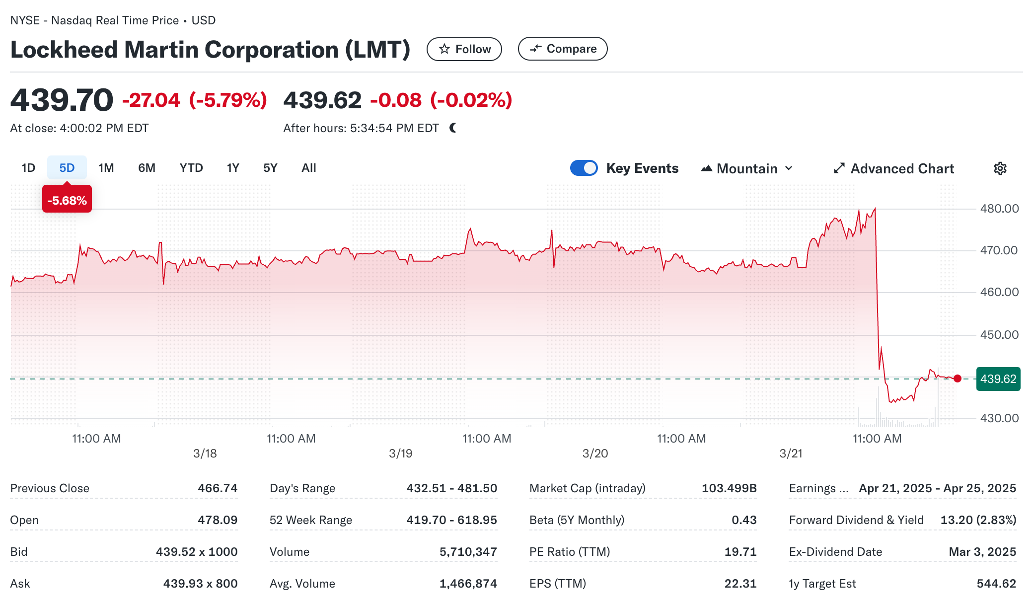 주가 역시 이에 민감하게 반응했습니다. 발표 당일 록히드 마틴 주가는 약 6% 하락, 투자자들은 F-35 중심 수익 구조에 대한 리스크를 재차 인식하게 되었고, 향후 방산 수주 다변화를 위한 구조적 전환이 필요하다는 압박이 커지고 있습니다.