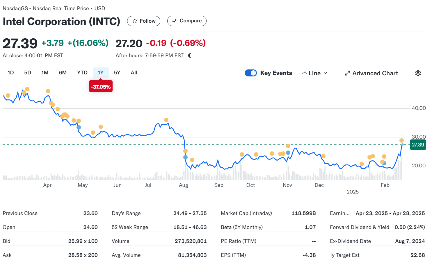 인텔의 낮아진 기업 가치: 한때 반도체 업계를 지배하던 인텔은 시장 점유율 하락과 적자로 인해 매력적인 인수 대상이 되었다.