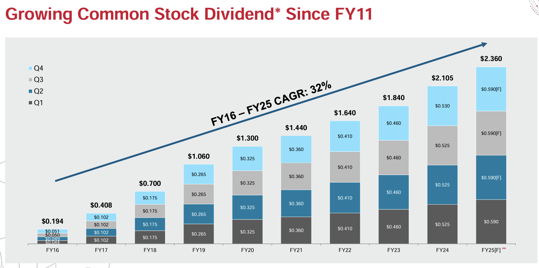 하지만 브로드컴의 AI 가속기 매출이 아직 전체 매출의 일부에 불과하다는 점을 기억해야 합니다. FY 2024 4분기 매출 140억 달러 중 네트워킹 부문 매출은 45억 달러였으며, 이 중 76%가 AI 가속기와 스위치 매출이었습니다.
