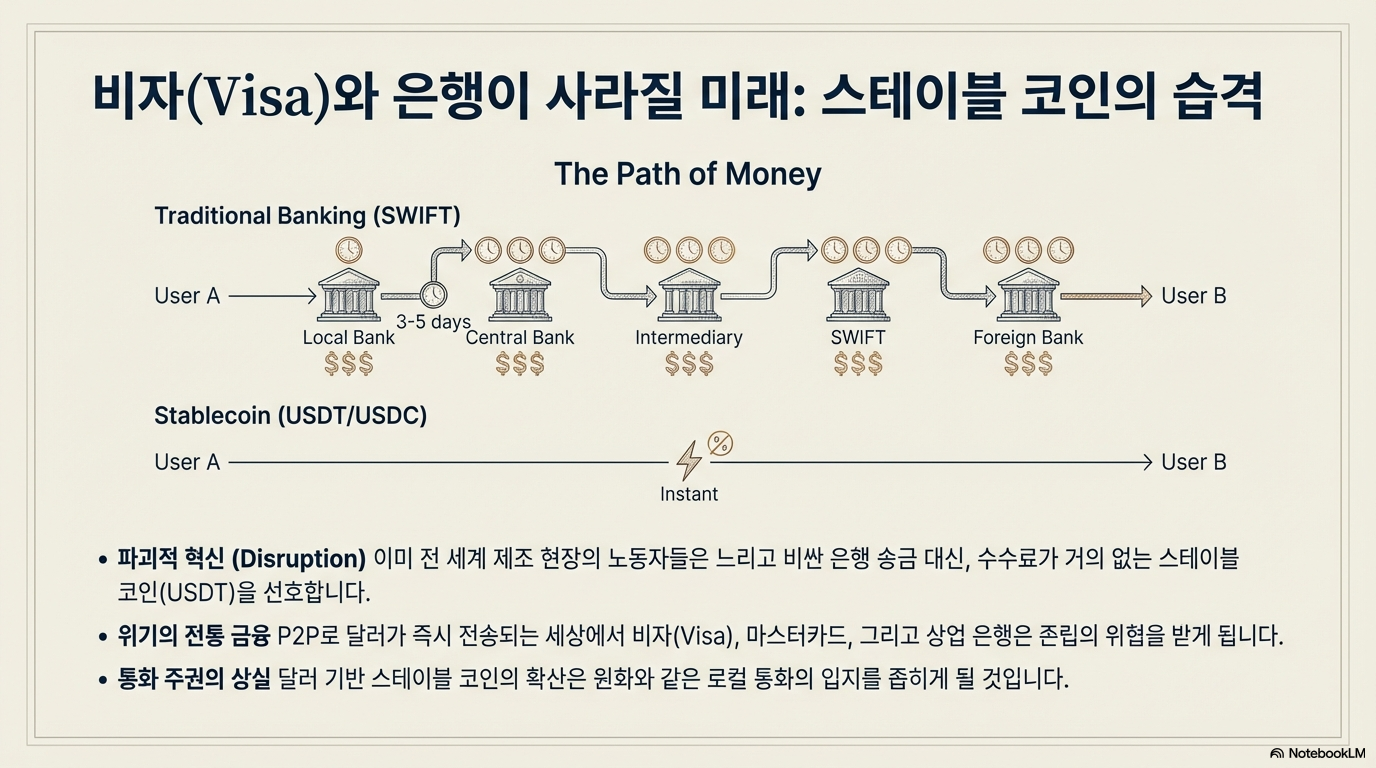 스테이블 코인이란, 미국 달러와 1:1로 가치가 연동되도록 설계된 암호화폐입니다. 오 교수의 예측은 충격적입니다. 이 스테이블 코인 때문에 비자, 마스터카드는 ‘역사 속에 사라질 운명’에 처할 수 있으며, 미국을 제외한 각국 중앙은행은 ‘개점 휴업 상태’에 빠질 수 있다는 것입니다. 이는 먼 미래의 이야기가 아닙니다. 이미 국내 제조업 현장의 많은 외국인 노동자들은 월급을 달러 스테이블 코인(테더)으로 받아 수수료 없이 간편하게 본국으로 송금하고 있습니다.