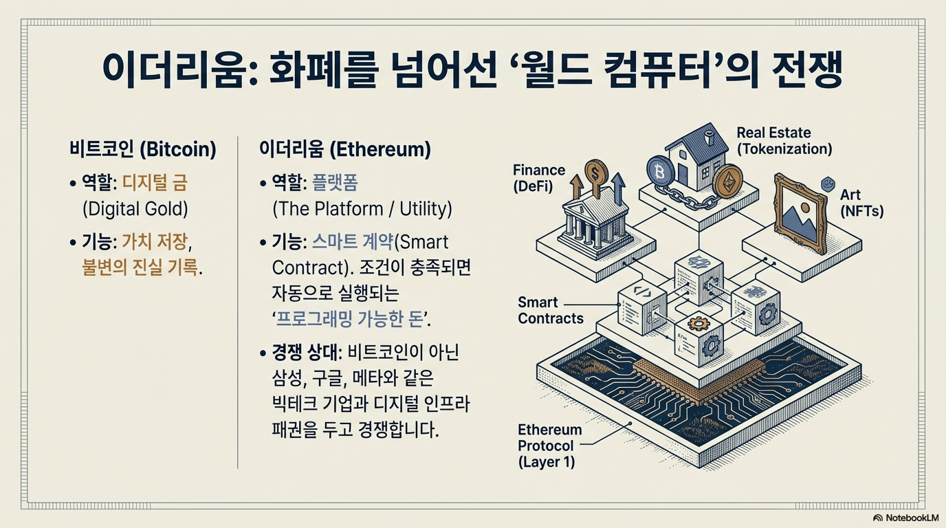 물론 중요한 예외는 있습니다. 바로 '이더리움'입니다. 비트코인과 달리 이더리움은 처음부터 '스마트 계약'이라는 명확한 쓰임새를 가지고 출발했습니다. 스마트 계약을 쉽게 이해하려면 정교한 자동판매기를 떠올리면 됩니다. 정해진 금액을 넣고 버튼을 누르면, 사람의 개입 없이도 계약(약속)에 따라 정확한 음료수를 내주고 거스름돈까지 돌려주는 것과 같습니다. 이러한 기능 덕분에 앞으로 주식, 채권, 부동산 등 현실의 자산들이 디지털 토큰으로 발행될 때, 이더리움이 그 핵심 플랫폼이 될 가능성이 매우 높습니다.
