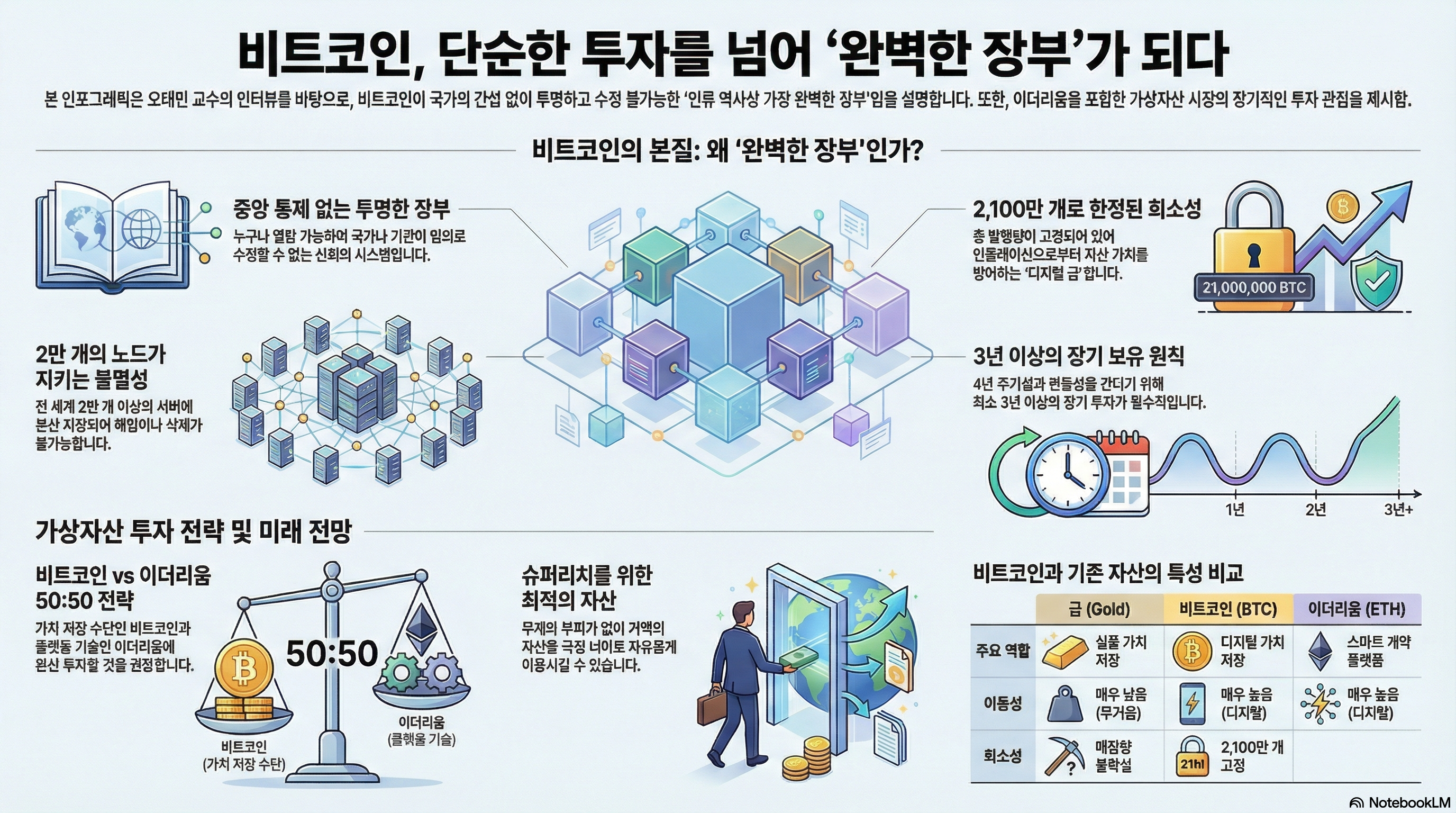 오태민 교수의 이야기를 통해 본 비트코인은 단순한 디지털 금이나 투기 자산을 넘어섭니다. 그것은 중앙 기관의 보증 없이 신뢰를 만들어내는 '완벽한 장부'이며, 국경 없는 자산 이전 수단이고, 기존 금융 질서에 근본적인 질문을 던지는 기술적, 철학적 도전입니다.