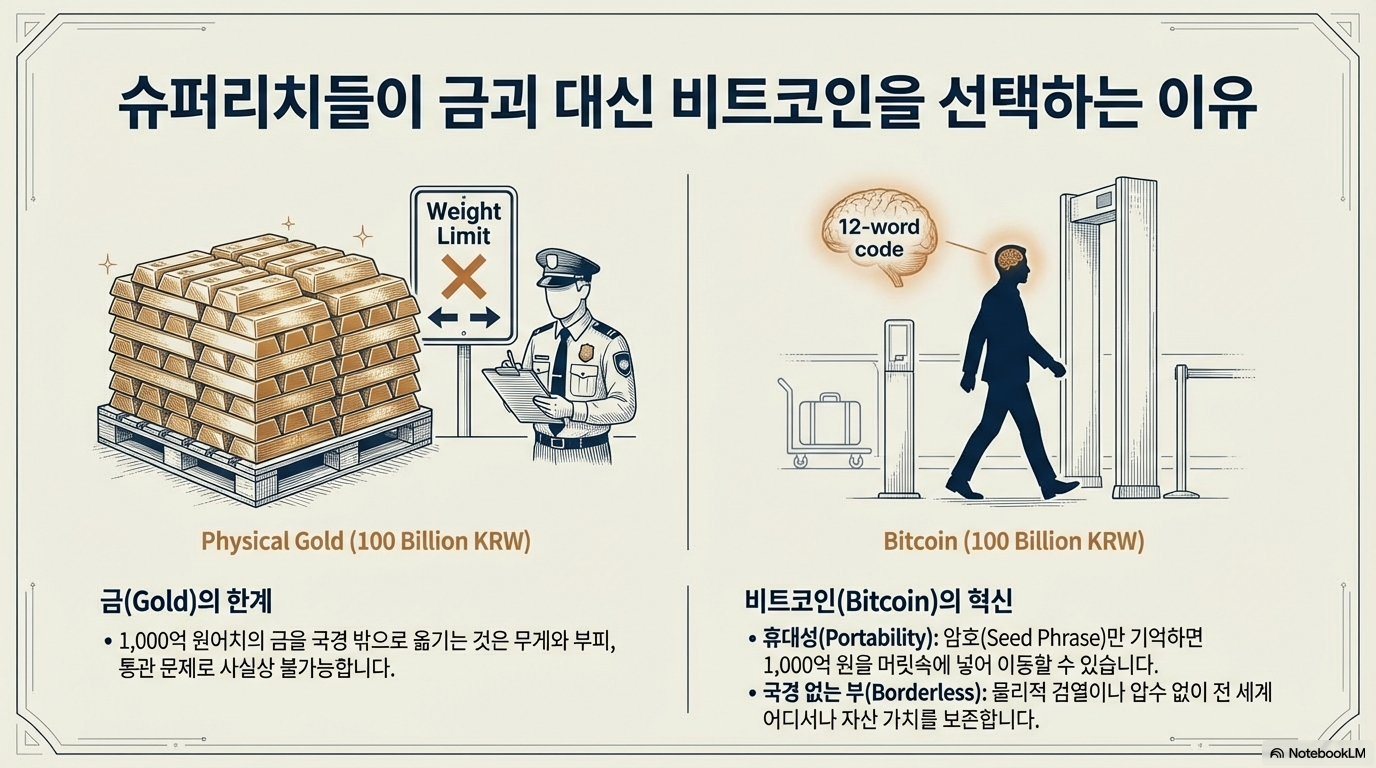 전쟁이나 급격한 정치 변동이 발생했을 때, 자산을 국경 너머로 옮겨야 한다면 어떨까요? 슈퍼리치들이 옮겨야 할 1천억 원 정도의 자산을 현금이나 금으로 바꾸는 것은 물리적으로 거의 불가능합니다. 5만 원권으로 10억 원만 만들어도 그 부피는 개인이 감당하기 어려울 정도로 어마어마합니다.