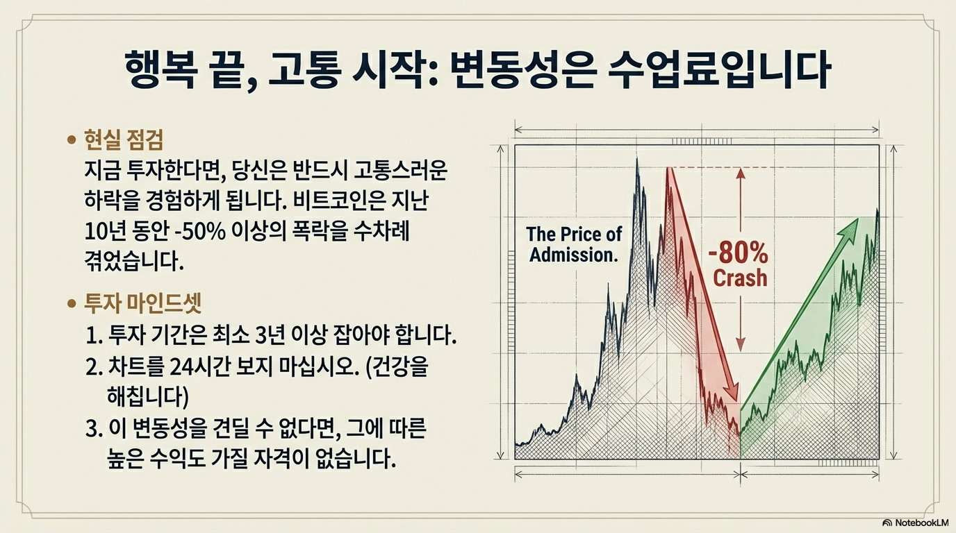 오 교수는 비트코인의 가능성을 높이 평가하면서도, 투자에 따르는 엄청난 정신적 스트레스를 솔직하게 경고합니다. 비트코인 시장은 극심한 변동성을 온몸으로 견뎌내야 하는 곳입니다. 오 교수 자신도 자산이 80%까지 하락하는 것을 두세 번, 50% 하락하는 것을 네댓 번 겪었다고 고백할 정도입니다. 24시간 돌아가는 차트를 보며 일희일비하는 투자는 정신과 육체를 심각하게 해칠 수 있다고 조언합니다.