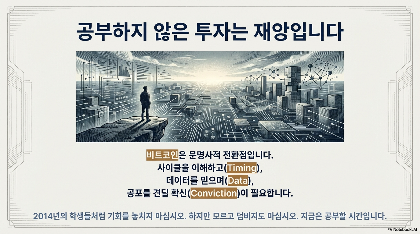 하지만 그는 역설적인 결론을 내립니다. 이러한 고통에도 불구하고, 우리는 이 새로운 자산을 외면해서는 안 된다는 것입니다. 지금 행동하지 않으면, 2014년에 그의 강의를 듣고도 비트코인을 사지 않았던 학생들처럼 큰 후회를 하게 될지도 모른다고 말합니다. 결국 비트코인 투자는 '더 큰 후회의 고통'을 피하기 위해 현재의 스트레스를 감내하는 과정일 수 있습니다.