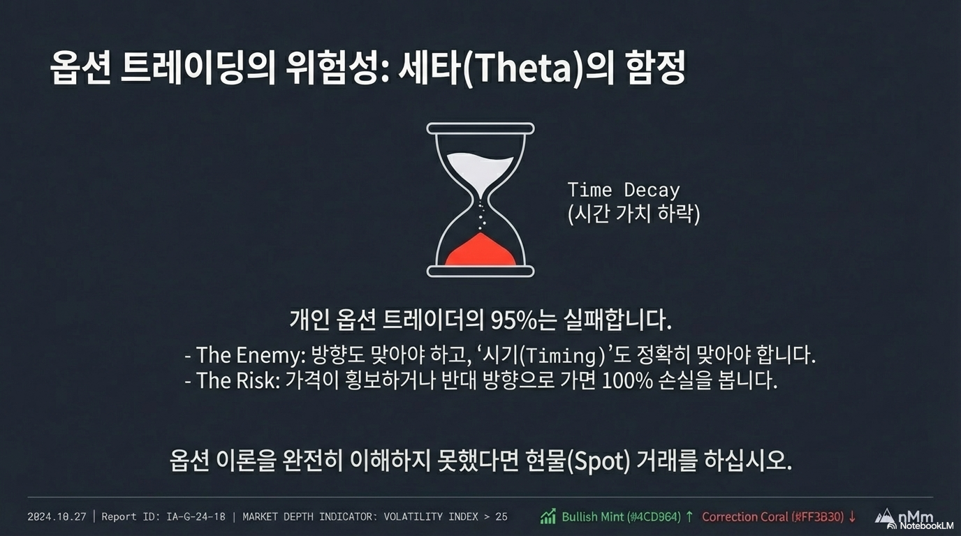 • 옵션 거래의 함정, '세타(Theta)': 옵션 투자자의 95%가 손실을 보는 이유는 **세타(Theta, 시간 가치 하락)**를 이해하지 못하기 때문입니다. 시간은 옵션 구매자의 편이 아니며, 방향성뿐만 아니라 '타이밍'까지 즉각적으로 맞추지 못하면 자산은 증발합니다.