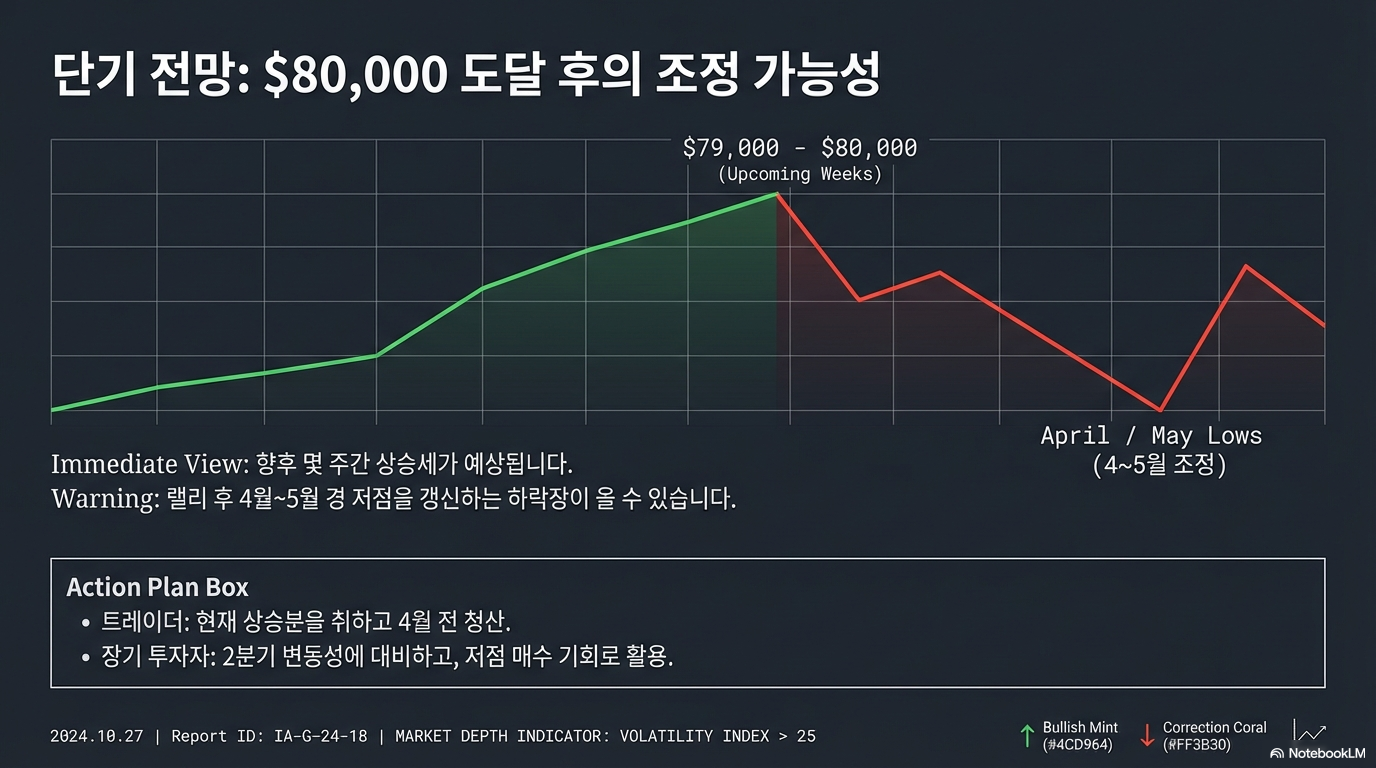 그는 단기적인 가격 흐름에 대해서도 구체적인 가이드라인을 제시합니다. 뉴턴의 분석에 따르면, 비트코인은 향후 몇 주 내에 79,000달러에서 80,000달러 선까지 랠리를 펼친 후, 4월과 5월 사이에 다시 한번 저점을 테스트하는 흐름을 보일 가능성이 큽니다. 이러한 변동성을 이해하는 것이 전략가와 일반 투자자의 차이입니다.