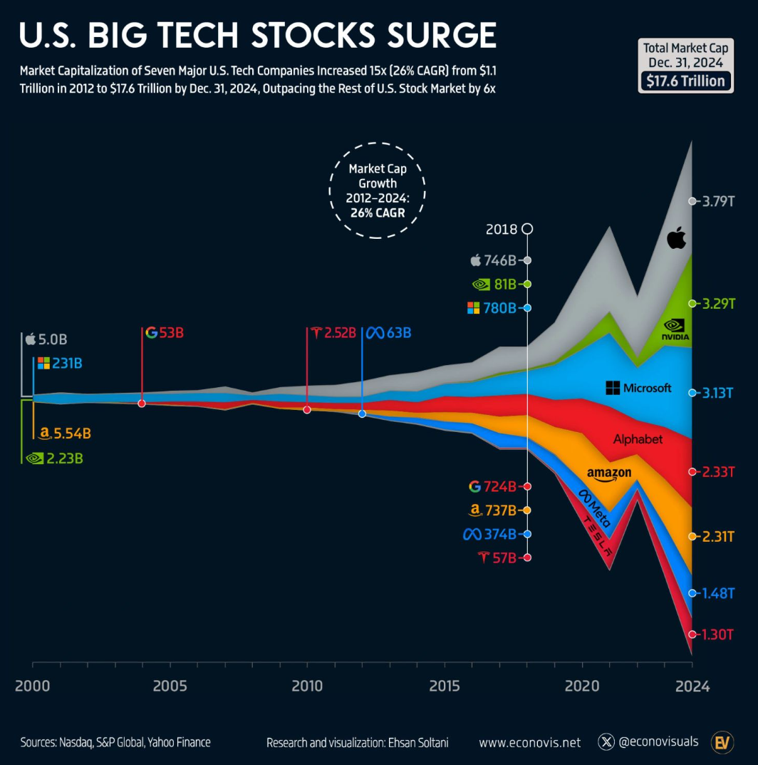 특히 2012년 이후, 빅테크 기업들로 불리는 애플, 엔비디아, 마이크로소프트, 알파벳(구글), 아마존, 메타(페이스북), 테슬라는 기술 혁신과 전략적 시장 확대를 통해 괄목할 만한 성과를 거두었습니다. 2024년 현재, 이들의 총 시장 가치는 17.6조 달러에 달하며, 이는 미국 전체 주식 시장 가치의 28%를 차지하는 수준입니다.