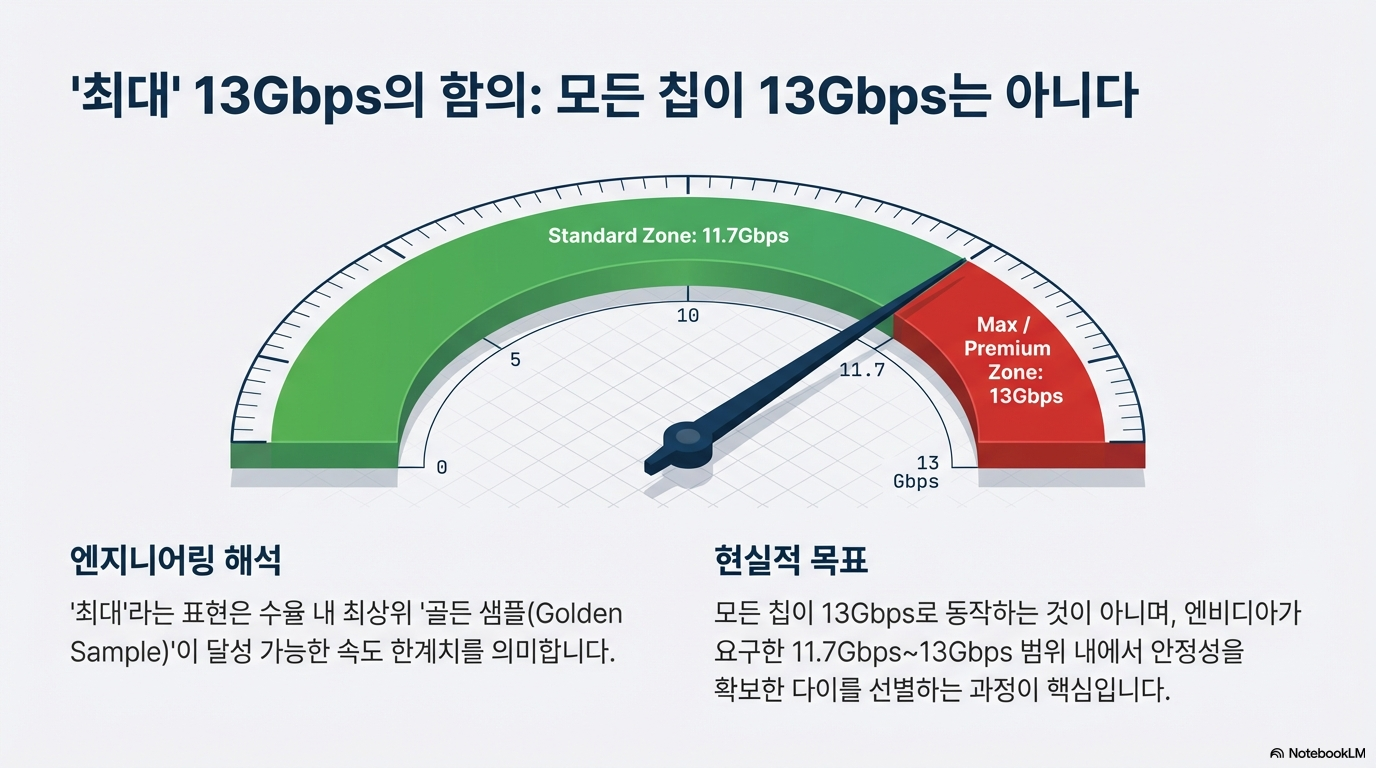 하지만 모든 칩이 13Gbps의 속도를 낼 수 있는 것은 아닙니다. 여기서 삼성의 '듀얼 빈(Dual Bin)' 전략이 등장합니다. 반도체 생산 시 발생하는 수율의 정규분포를 활용하여, 특성이 가장 뛰어난 소수의 '골든 샘플'을 13Gbps급 상위 빈으로 선별하고, 일반적인 제품을 11.7Gbps급으로 공급하는 방식입니다. 이는 기술적 리더십을 상징하는 '최고 속도' 타이틀을 거머쥐는 동시에, 다양한 품질의 칩을 버리지 않고 판매하여 수익성을 극대화하려는 전략적 선택입니다. 전문가들 역시 이 숫자의 실체를 다음과 같이 해석합니다.