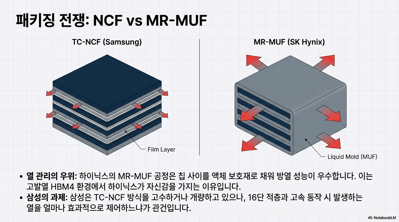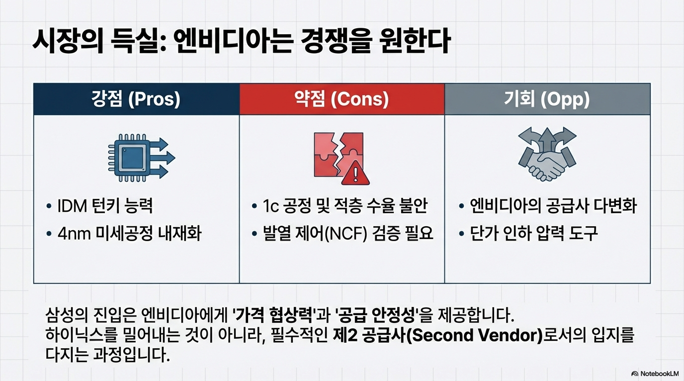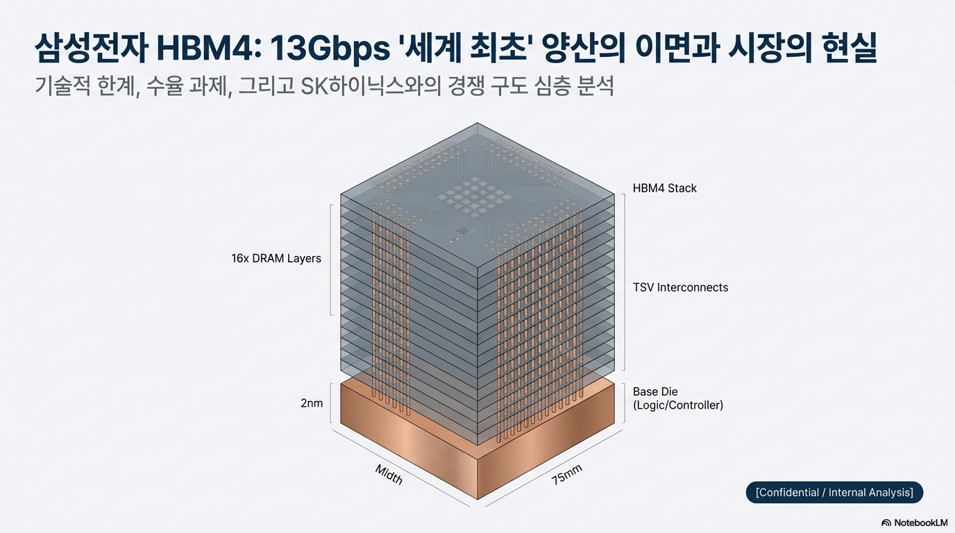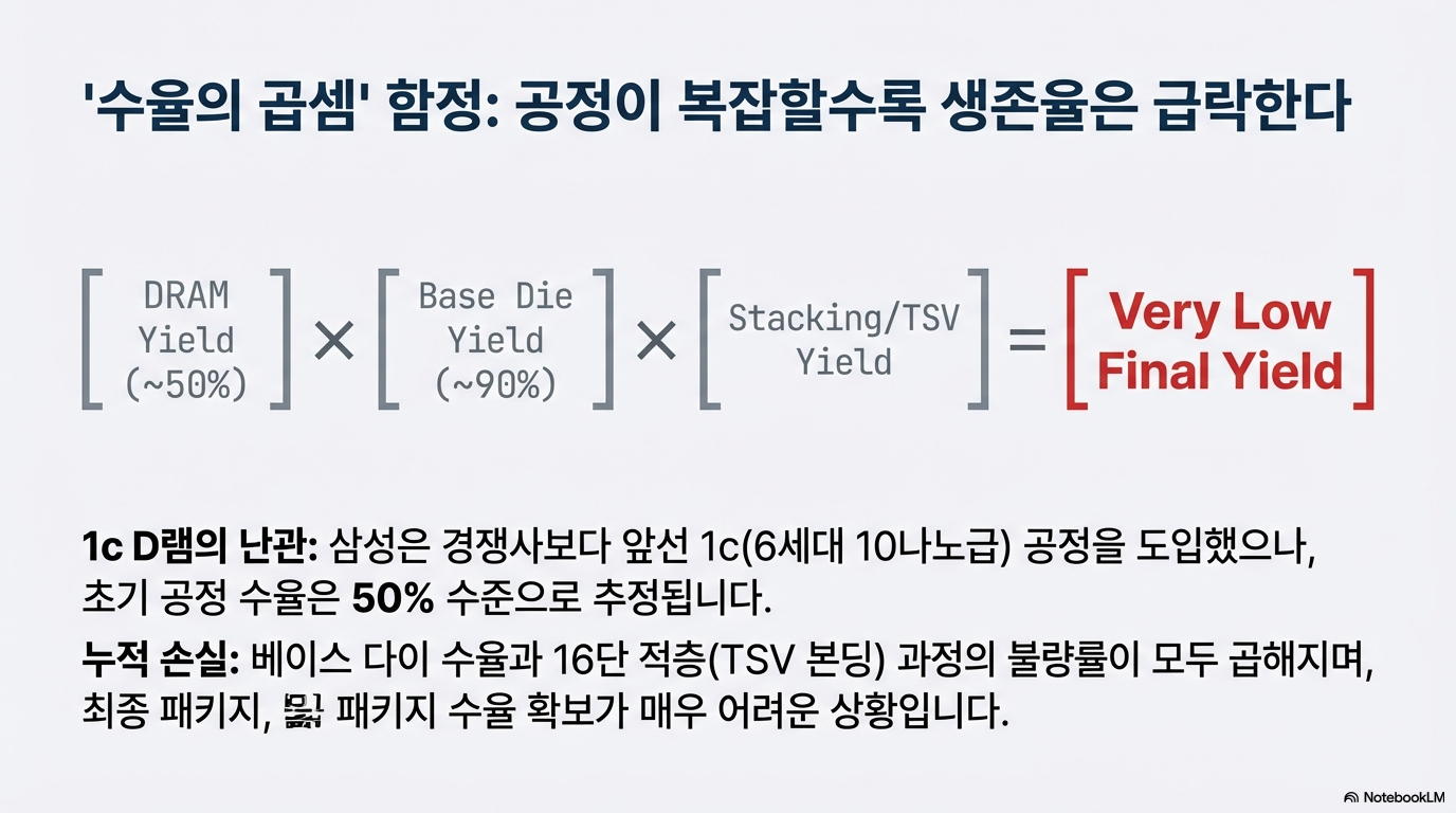 특히 수율 문제는 여전히 가장 큰 산입니다. 현재 업계가 추정하는 삼성 1c D램의 수율은 약 50% 수준이며, 여기에 4나노 로직 다이 수율(약 90%)을 산술적으로 곱하기만 해도 최종 수율은 45%대로 떨어집니다. 여기에 16단 적층을 위한 TSV(실리콘 관통 전극) 공정과 본딩 과정에서의 손실까지 합산하면, 실제 완제품 수율은 더욱 가혹한 수준일 가능성이 큽니다. 결국 이번 발표는 완전한 상용화보다는 시장 점유율 과반을 점유한 SK하이닉스에 대항하여 엔비디아 내에서의 협상력을 높이려는 전략적 선언에 가깝습니다.