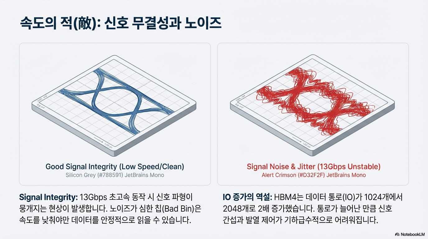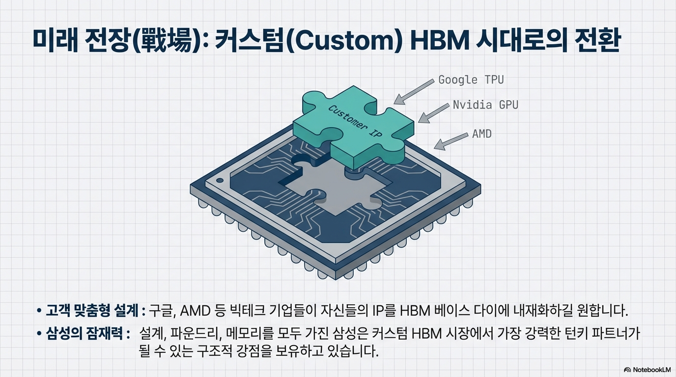 HBM4부터는 데이터 통로인 IO(Input/Output)가 2048개로 이전 세대보다 두 배 늘어납니다. 통로가 많아지면 신호가 겹치거나 뭉개지는 현상이 발생하기 쉬운데, 삼성은 4나노 공정의 미세화된 물리 계층(PHY) 설계 능력을 통해 이를 해결했습니다. 특히 신호의 타이밍을 다시 잡아주는 '리타이밍(Re-timing)' 기능을 강화하여 신호 무결성(Signal Integrity)을 확보한 것이 결정적입니다. SK하이닉스가 TSMC와 손을 잡는 '연합군' 체제를 택한 것과 달리, 삼성은 설계부터 파운드리, 메모리, 첨단 패키징까지 혼자 수행하는 IDM(종합 반도체 기업)으로서의 '턴키 솔루션'을 승부수로 던졌습니다. 이는 공급망 리스크를 줄이는 동시에 외부 파운드리 비용을 절감하여 커스텀 HBM 시장에서 강력한 가격 경쟁력을 갖추겠다는 포석입니다.