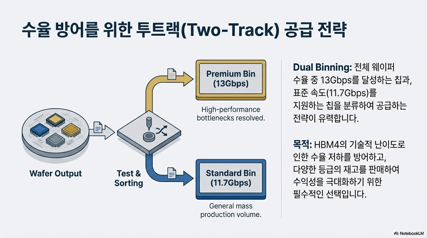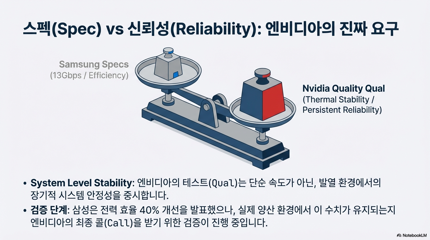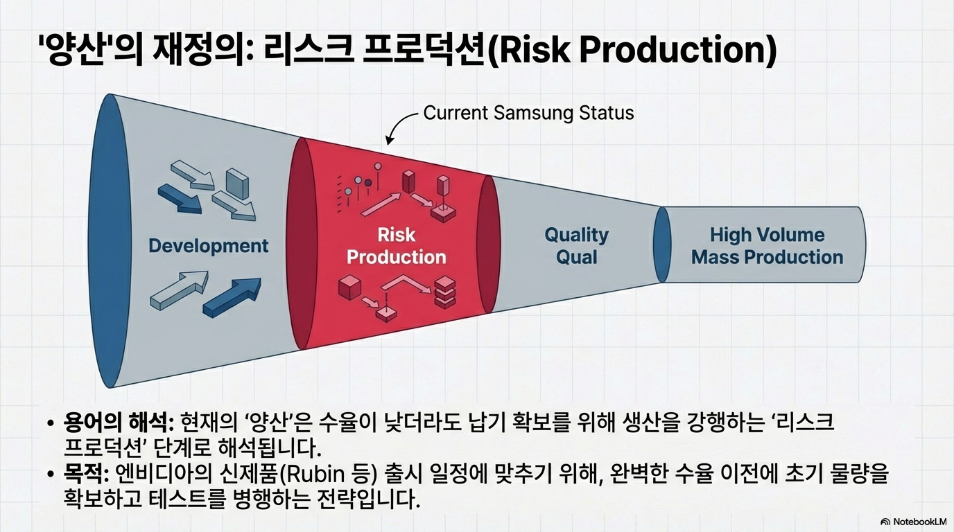 화려한 발표 이면에는 저널리스트로서 짚고 넘어가야 할 냉정한 데이터가 존재합니다. 삼성이 '양산'이라는 표현을 썼지만, 실제 시장에서는 이를 '리스크 프로덕션(Risk Production)' 단계로 해석하는 시각이 지배적입니다. 엔비디아가 하반기 차세대 GPU인 '베라 루빈(Vera Rubin)' 출시를 앞두고 물량 확보를 위해 HBM4 공급처 다변화를 강하게 압박하고 있기 때문입니다.