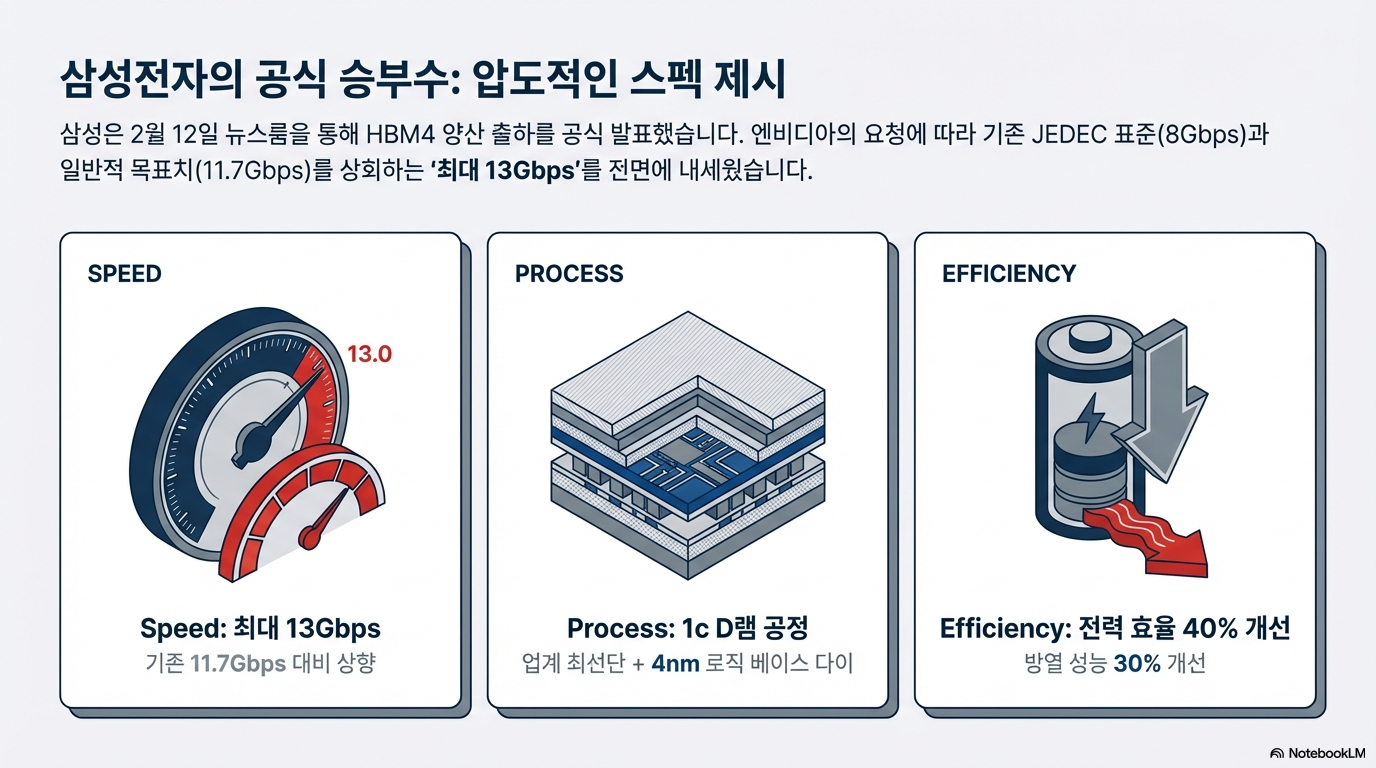 삼성이 제시한 '최대 13Gbps'는 업계 표준을 뒤흔드는 수치입니다. 반도체 표준 협의체(JEDEC)가 정한 HBM4의 기본 규격이 8Gbps이고, 최대 고객사인 엔비디아가 요구한 속도가 11.7Gbps임을 감안하면 삼성은 이미 고객의 기대치를 상회하는 '오버스펙'을 달성한 셈입니다.