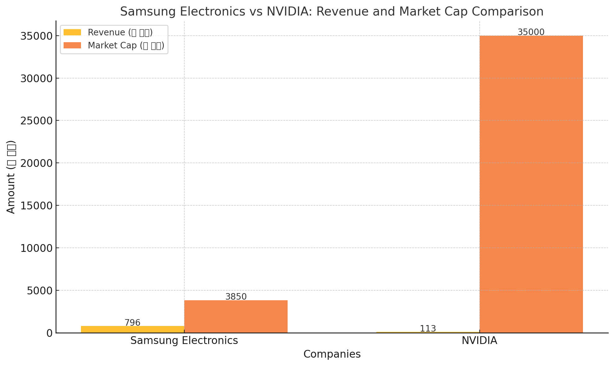 엔비디아의 시가총액은 약 3.5조 달러로, 삼성전자(3,850억 달러)보다 약 9배 높습니다. 이는 투자자들이 엔비디아의 AI 및 데이터센터 기술의 잠재력과 미래 지배력을 높이 평가하기 때문입니다.