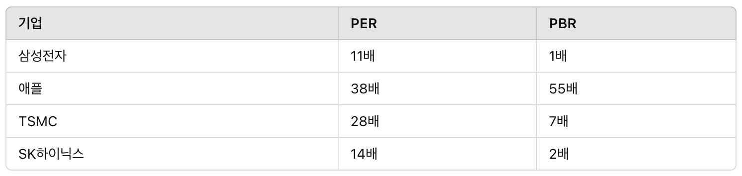 삼성전자는 경쟁사인 TSMC(대만), 애플(미국) 등과 비교해도 PER과 PBR이 모두 현저히 낮다.