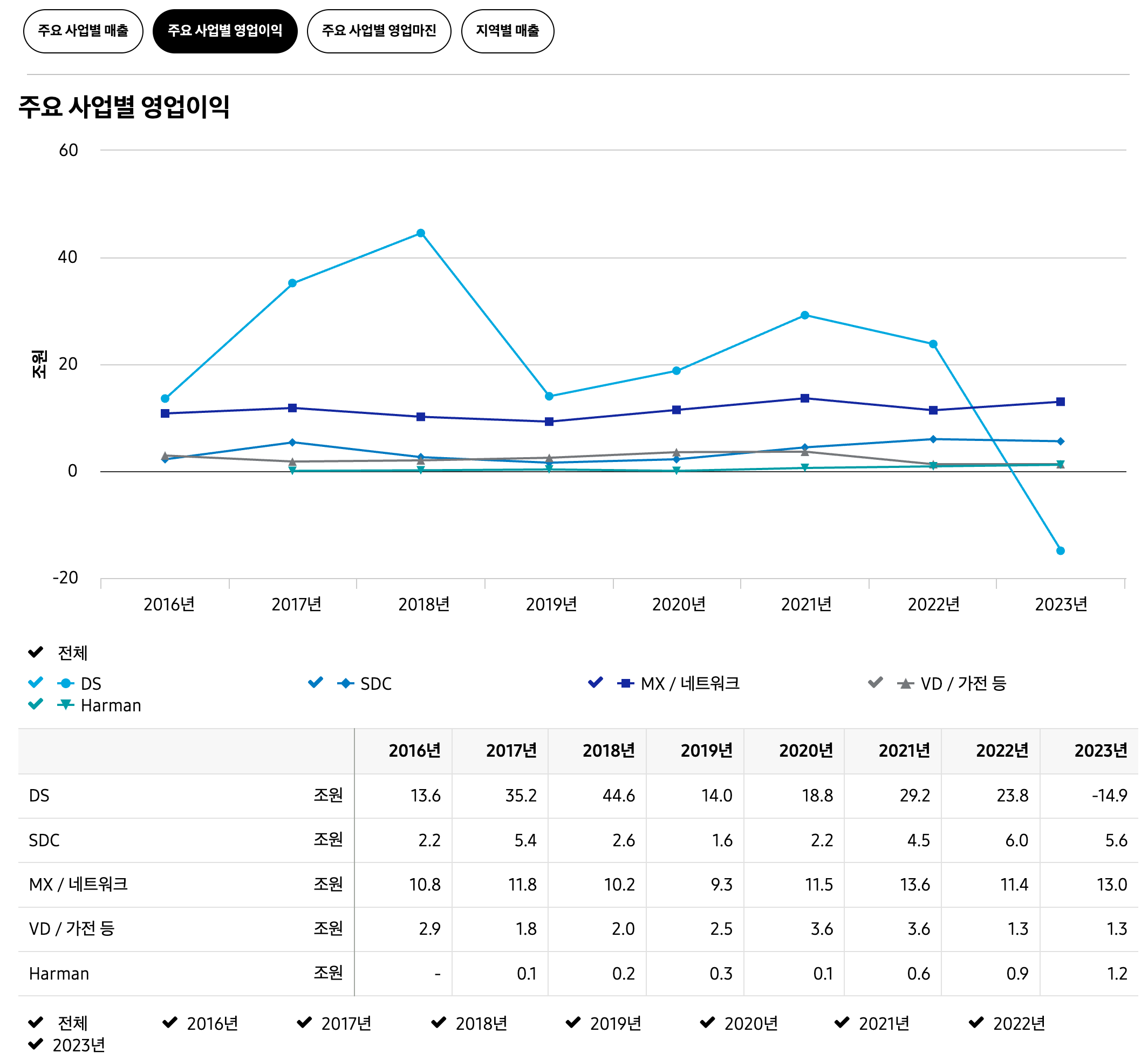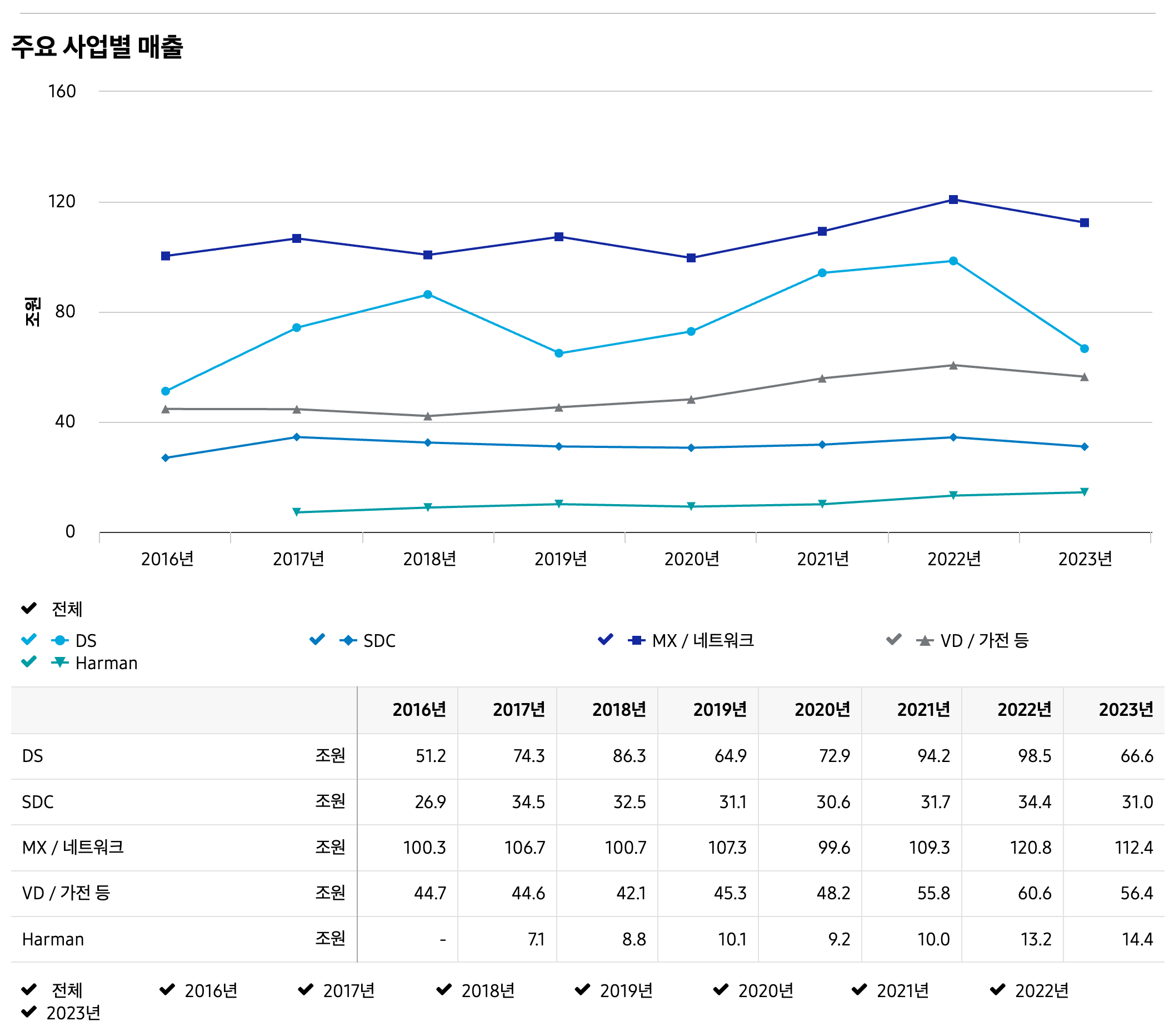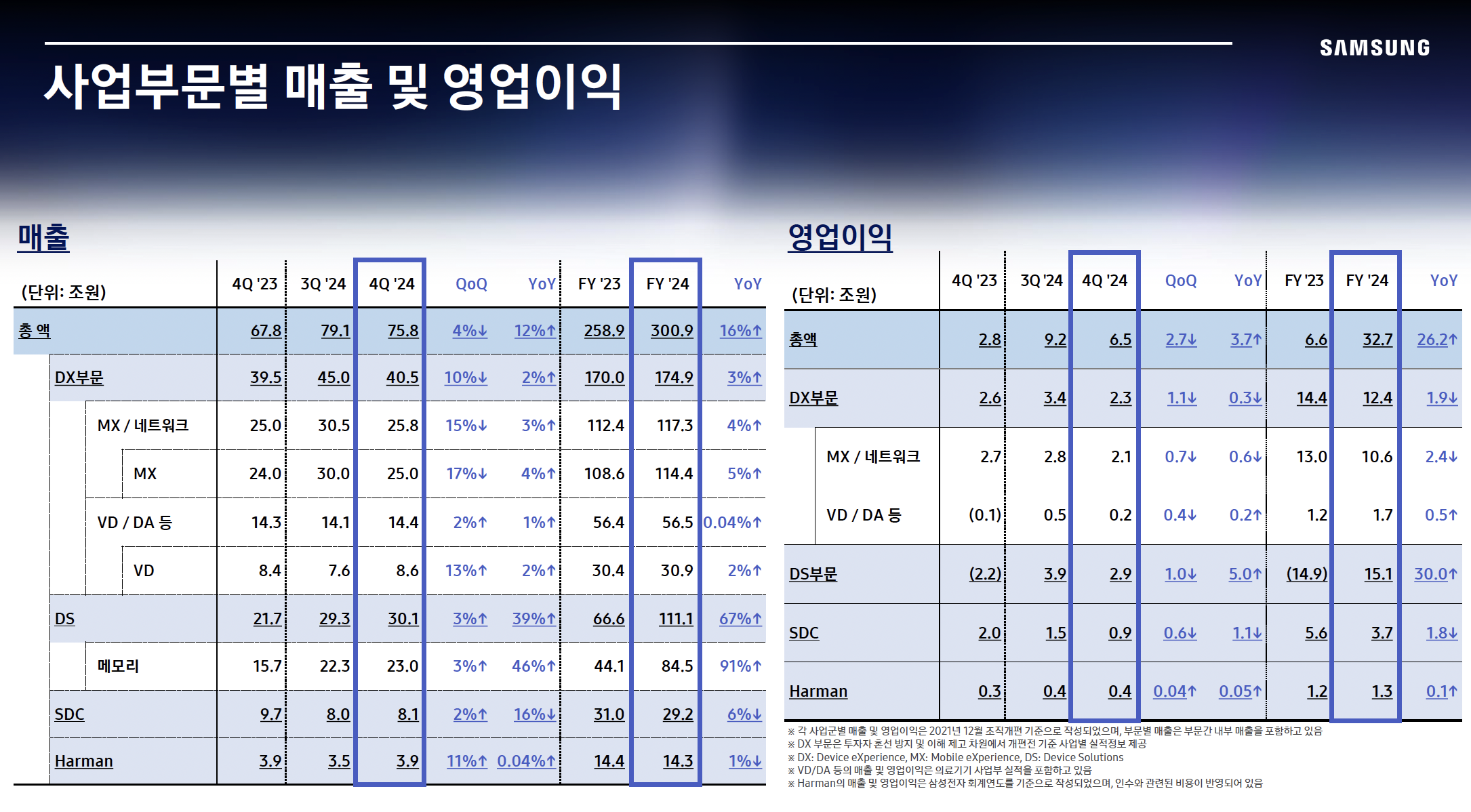 ✅ 그 외 사업부: 삼성디스플레이(SDC), 하만(자동차 전장 및 오디오) 등이 포함된다.