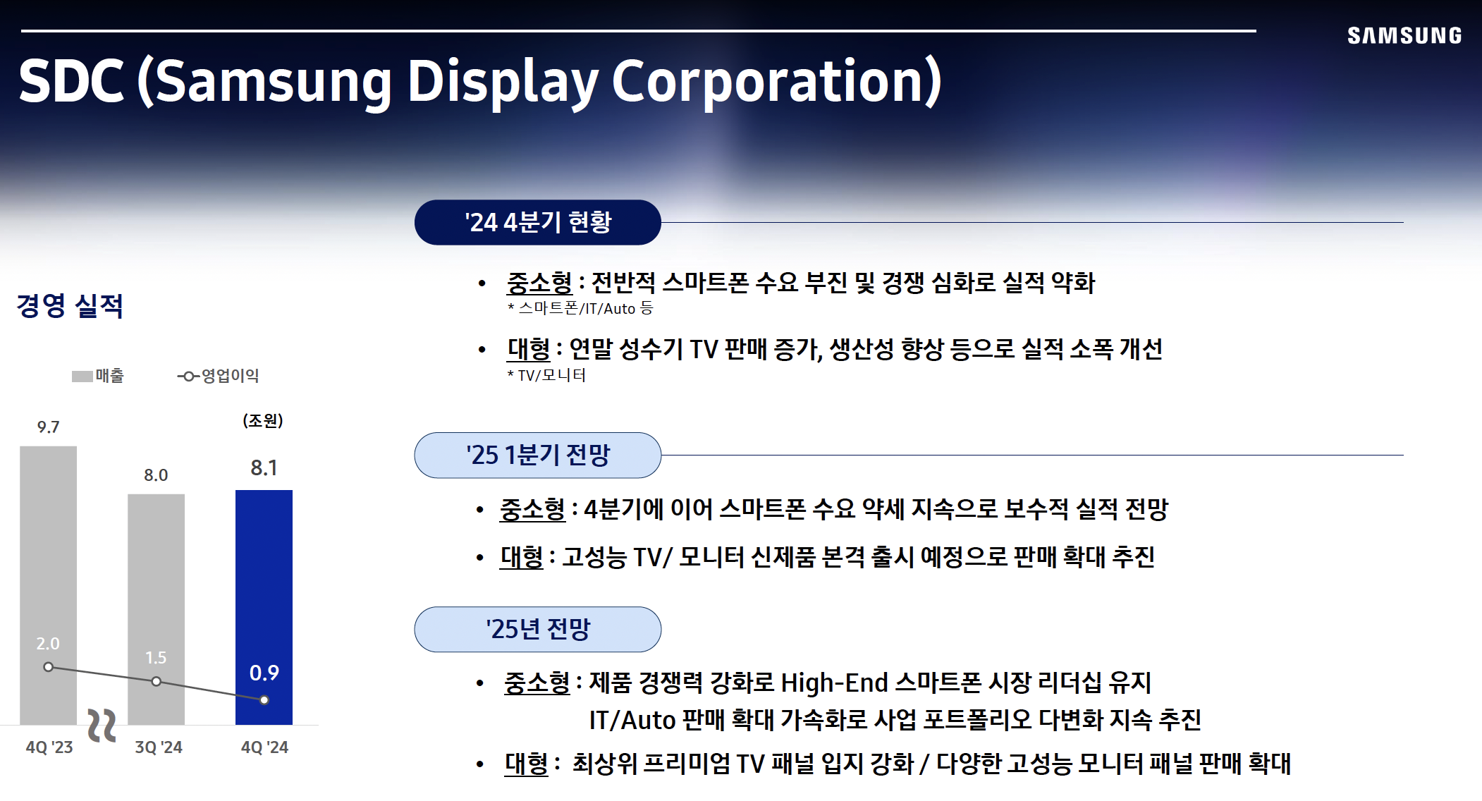 삼성디스플레이(SDC)는 스마트폰, 태블릿, 노트북, TV 등에 사용되는 OLED 및 QD-OLED 패널을 생산하는 사업부로, 글로벌 디스플레이 시장에서 강력한 입지를 유지하고 있다.