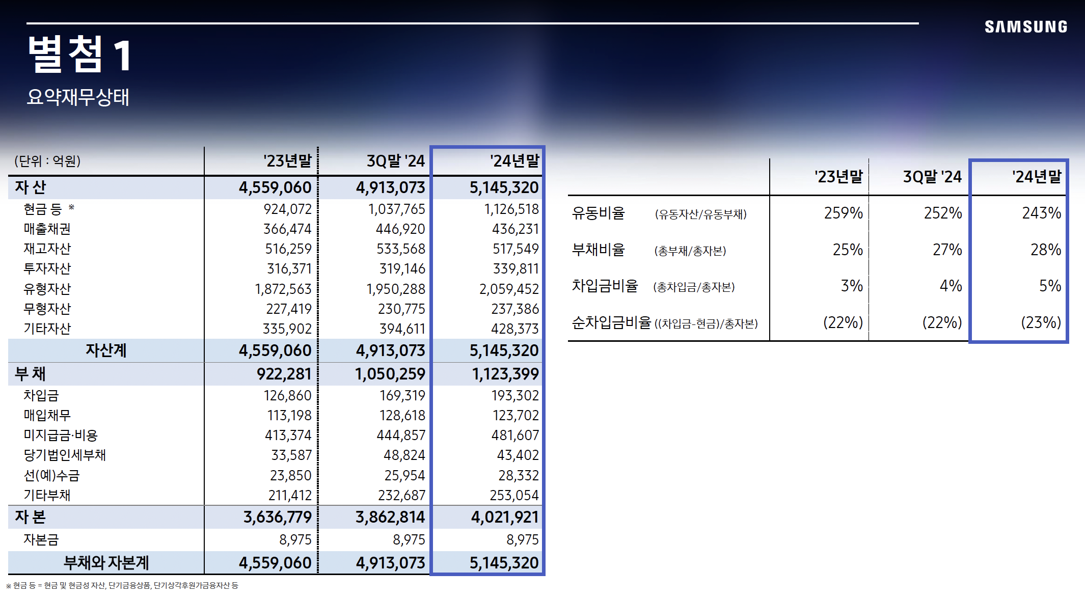 삼성전자는 2024년 말 기준 총자산 514조 원, 부채 112조 원, 자본 402조 원을 보유하고 있다. 부채비율은 28%로 매우 낮으며, 보유 현금만 100조 원이 넘는다.