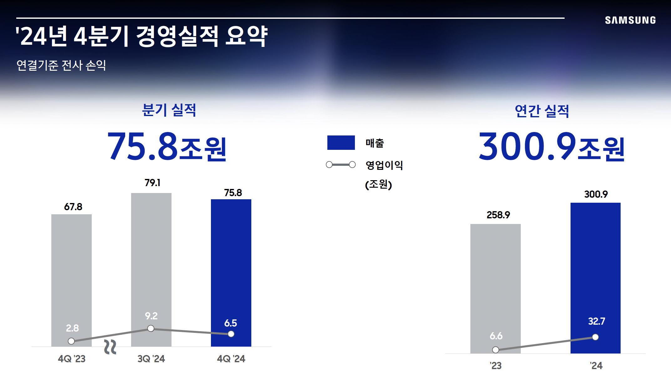 반도체 시장이 침체기를 겪으며 삼성전자의 실적도 한동안 부진했지만, 2024년 영업이익 32조 원을 기록하며 2023년(6조 원) 대비 강한 반등을 보였다. 그럼에도 불구하고 삼성전자의 주가는 여전히 역사적 저평가 구간에 머물러 있으며, 시장에서는 삼성전자가 침몰하는 기업인지, 다시 도약할 가능성이 있는 기업인지에 대해 논쟁이 계속되고 있다.